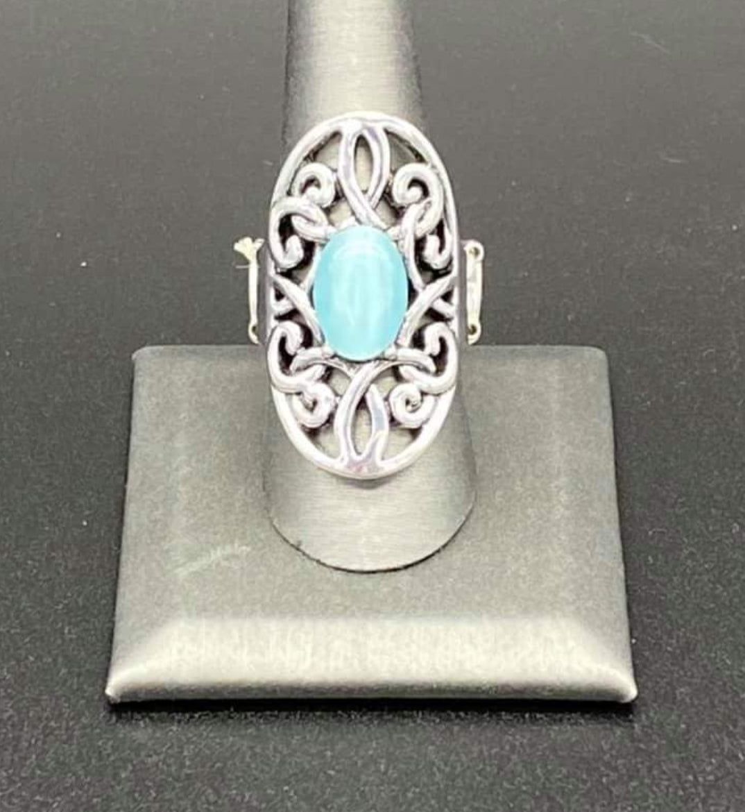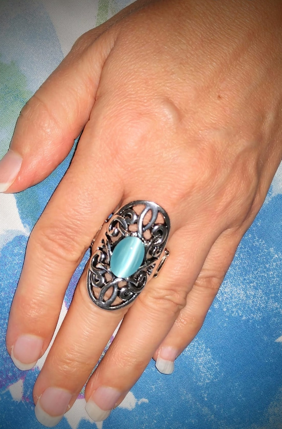 A glowing blue cat's eye stone is pressed into the center of an oval backdrop swirling with vine-like filigree for a whimsical look. Features a stretchy band for a flexible fit.