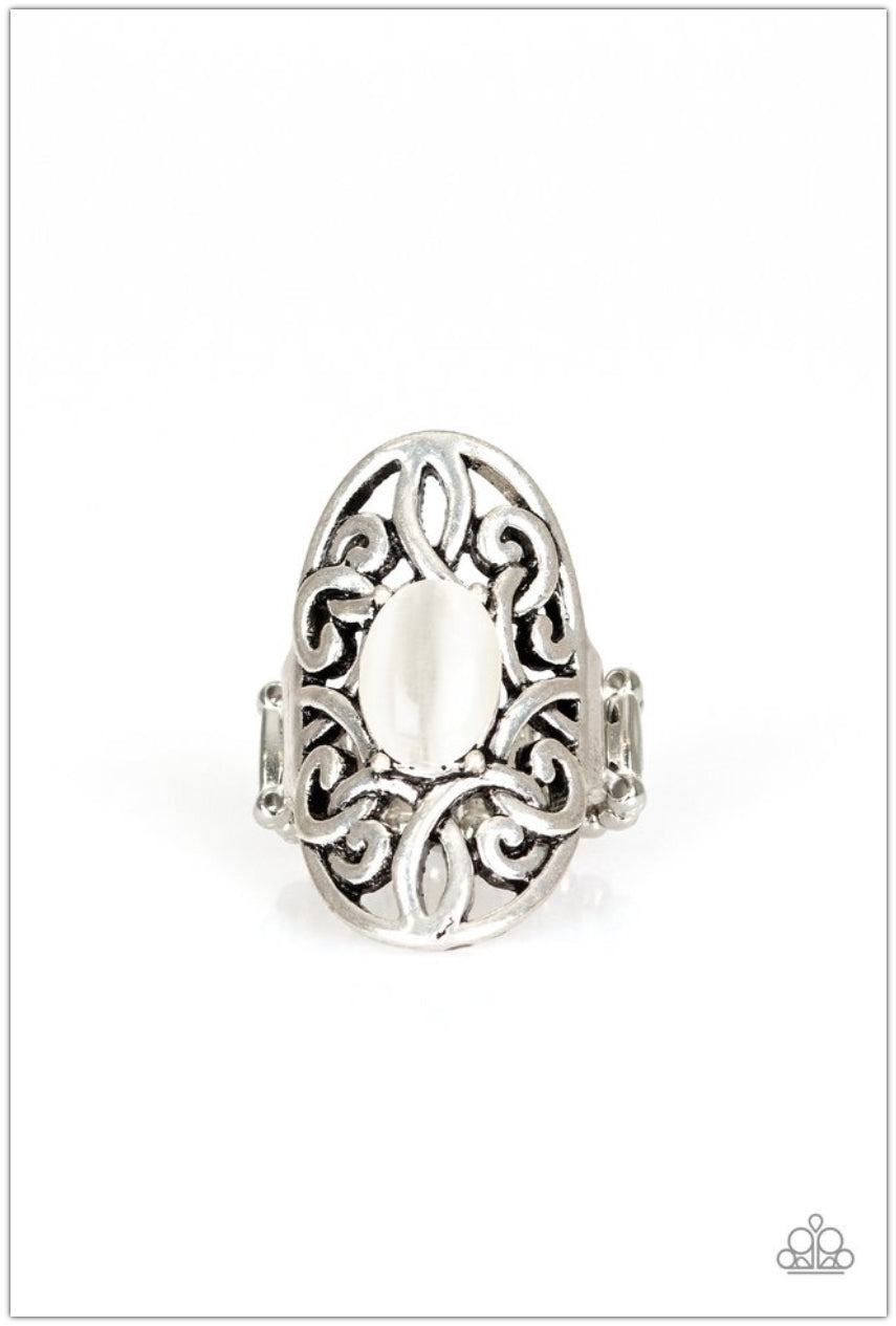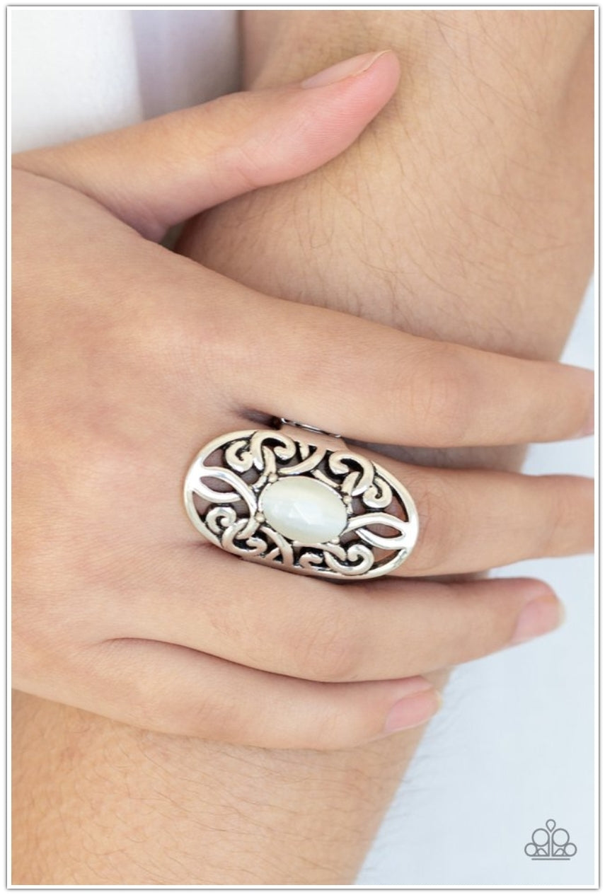 A glowing white cat's eye stone is pressed into the center of an oval backdrop swirling with vine-like filigree for a whimsical look. Features a stretchy band for a flexible fit.