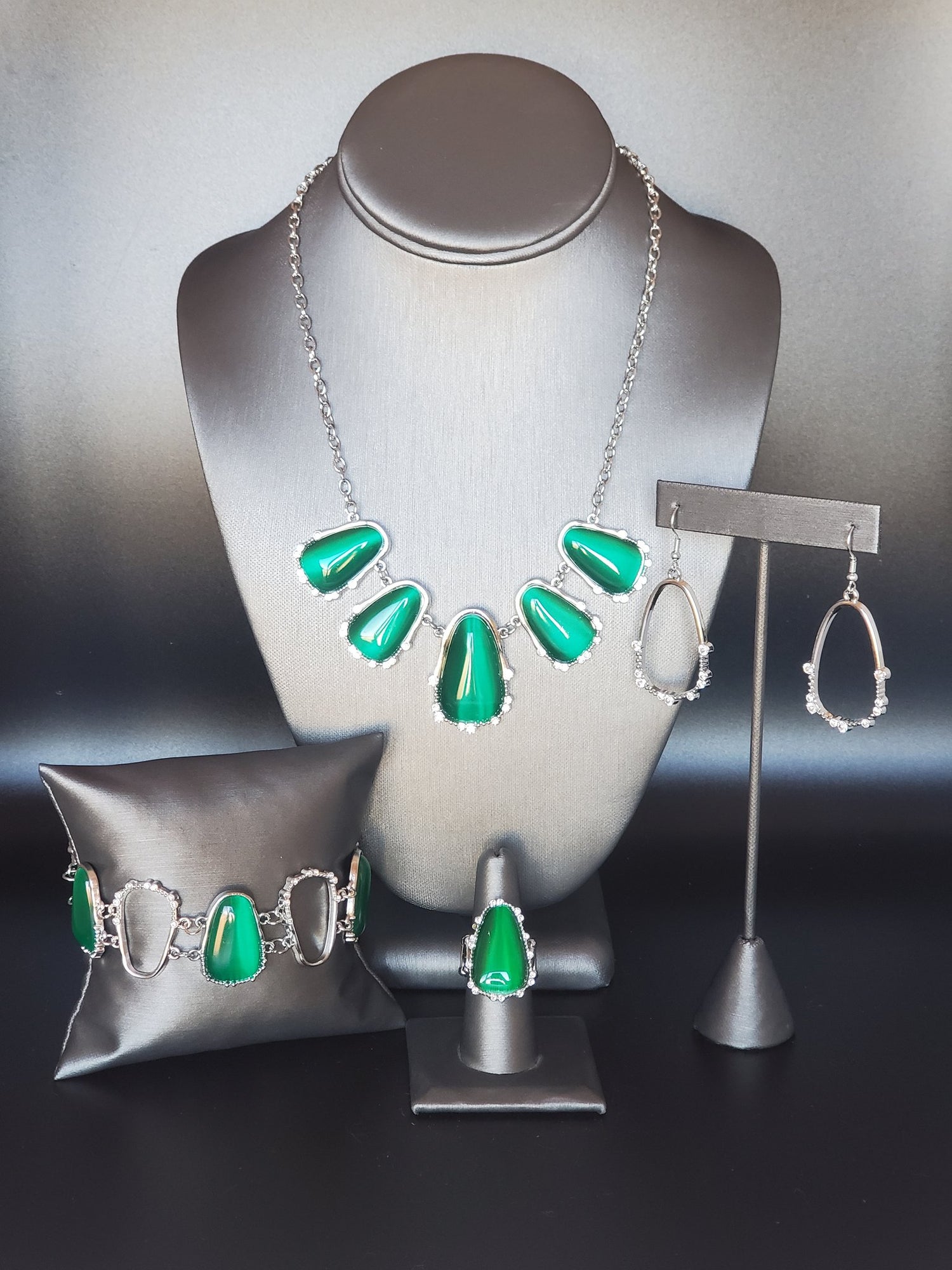 Necklace: "Newport Princess" (P2ST-GRXX-081ZT)- A collection of asymmetrical Mint cat’s eye stone teardrops are encased inside imperfect silver frames as they delicately link below the collar. The dainty silver frames are sporadically dotted in dainty silver studs and glassy white rhinestones, adding delicate sparkle to the ethereal display. Features an adjustable clasp closure.