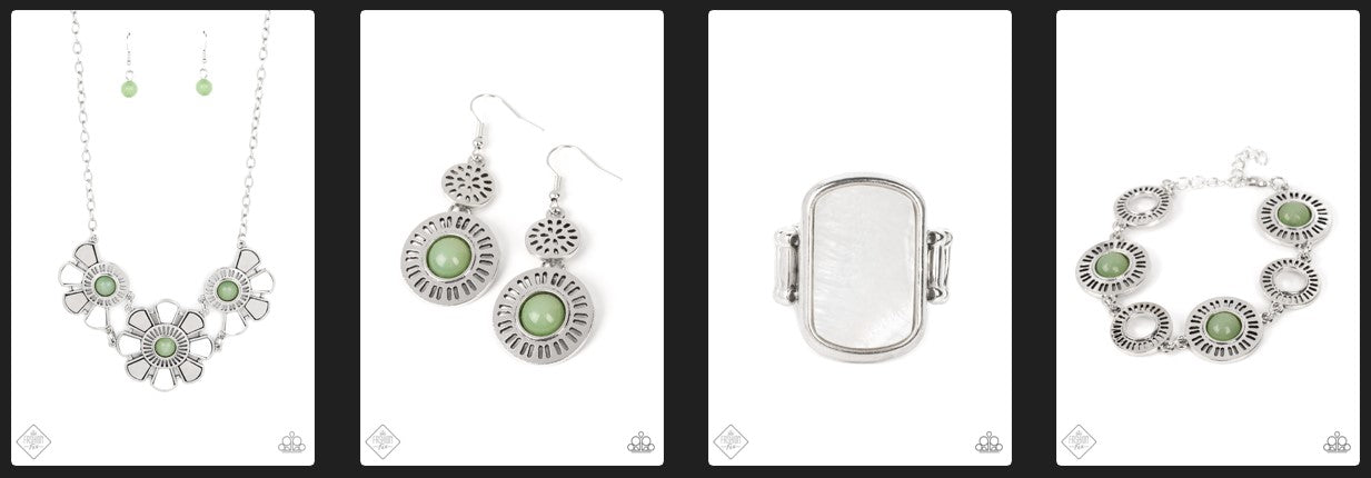 Bracelet: "Coastal Charmer" (P9BA-GRXX-021IC) -- Airy silver frames radiate around open centers while larger silver frames feature linear cutouts with milky bead centers in the Pantone® of Basil. The cheerful designs link together around the wrist creating a whimsically industrial vibe. Features an adjustable clasp closure. Sold as one individual bracelet.