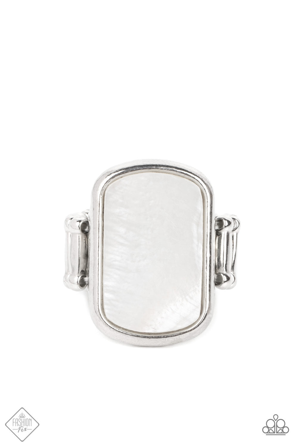 Ring: "Tidal Tranquility" (P4SE-WTXX-190IC) -- An oversized rectangular white pearlescent shell is encased in a simple silver frame resulting in a refreshingly tranquil centerpiece atop the finger. Features a stretchy band for a flexible fit. Sold as one individual ring.