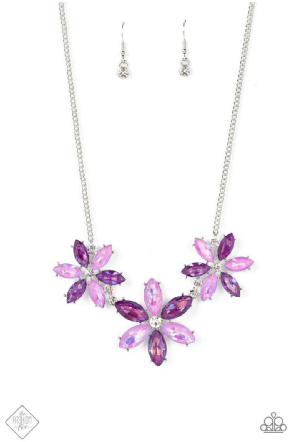 NECKLACE IS SOLD OUT! Necklace: "Meadow Muse - Purple" (P2ST-PRXX-139IY) --- Dark and light purple marquise cut rhinestones gather into whimsical flowers dotted with brilliant white rhinestone centers. The sparkling purple gems are set in pronged settings and connect to a dainty silver chain creating a fanciful display across the collar. Features an adjustable clasp closure. Sold as one individual necklace. Includes one pair of matching earrings.