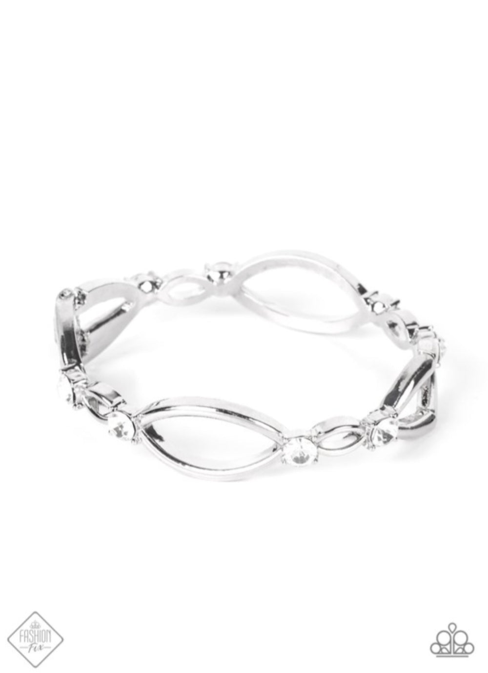Bracelet: "Interwoven Illusion - White" (P9BA-WTXX-030IY) --- Airy marquise-shaped frames are dotted with brilliant white rhinestones as they connect end to end across the wrist. The high sheen silver and sparkling gems offer a modern take on a classic style. Features a hinged closure. Sold as one individual bracelet.
