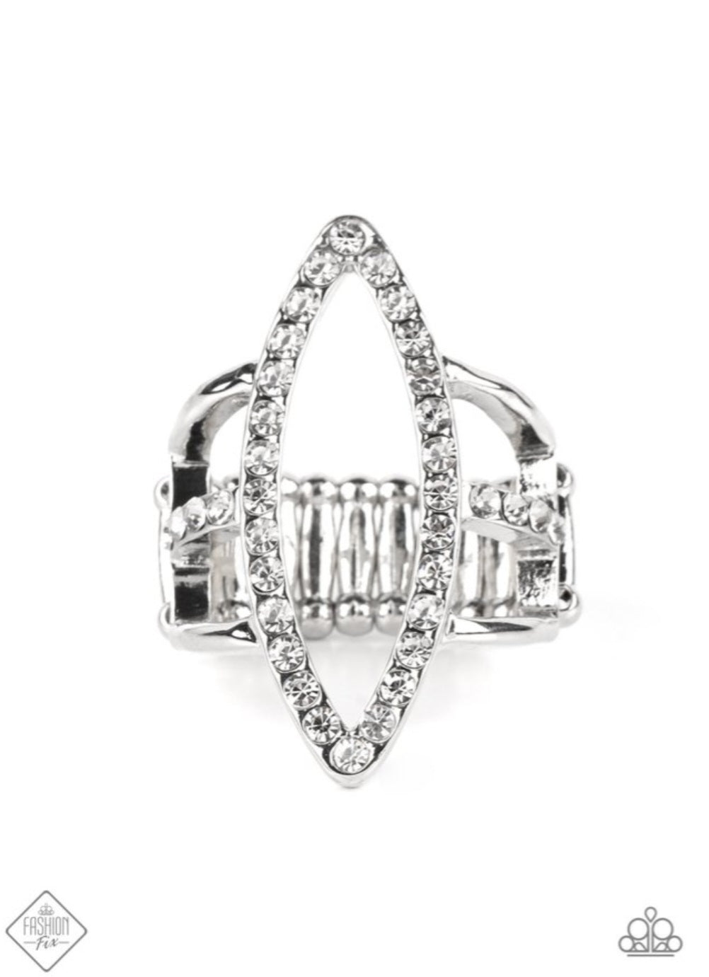 Ring: "Icy Intuition - White" (P4ST-WTXX-017IY) --- An exaggerated marquise-shaped frame dotted with rhinestones connects to three bands of silver that wrap around the finger. The center band is lined with more rhinestones, adding noteworthy sparkle to the airy design. Features a stretchy band for a flexible fit. Sold as one individual ring.
