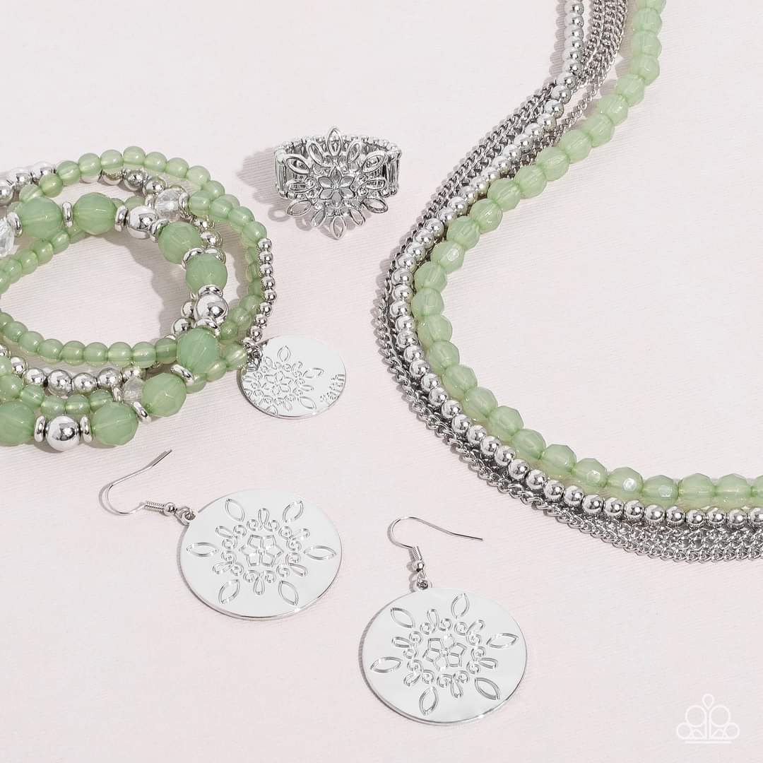NECKLACE: Boardwalk Babe - Green - P2BA-GRXX-023KG -- Shiny silver beads fall together with classic silver chains to create shimmery layers along the collar. A strand of opaque, faceted beads, in the calming shade of Loden Frost, emerges from the backdrop of metallic sheen, adding a subtle pop of color to the invigorating design. Features an adjustable clasp closure.