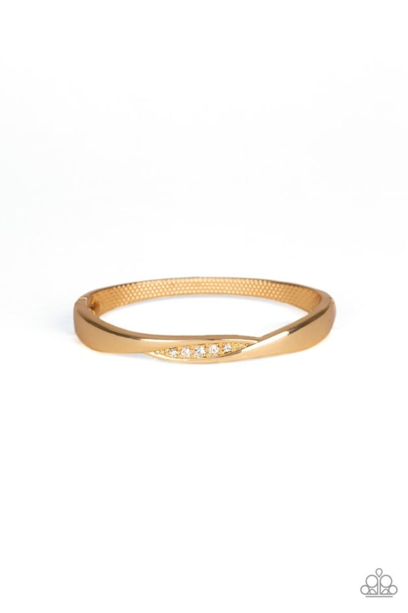 The studded center of a dainty gold bangle-like bracelet is encrusted in a single row of glassy white rhinestones for a refined finish. Features a hinged closure.