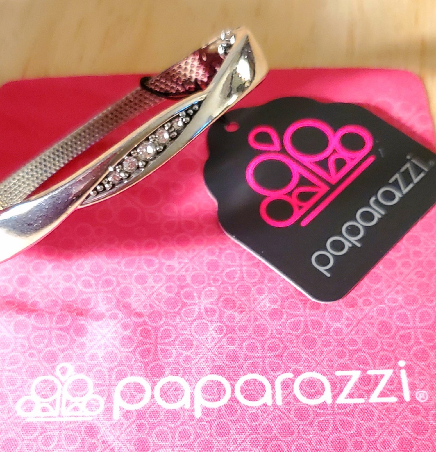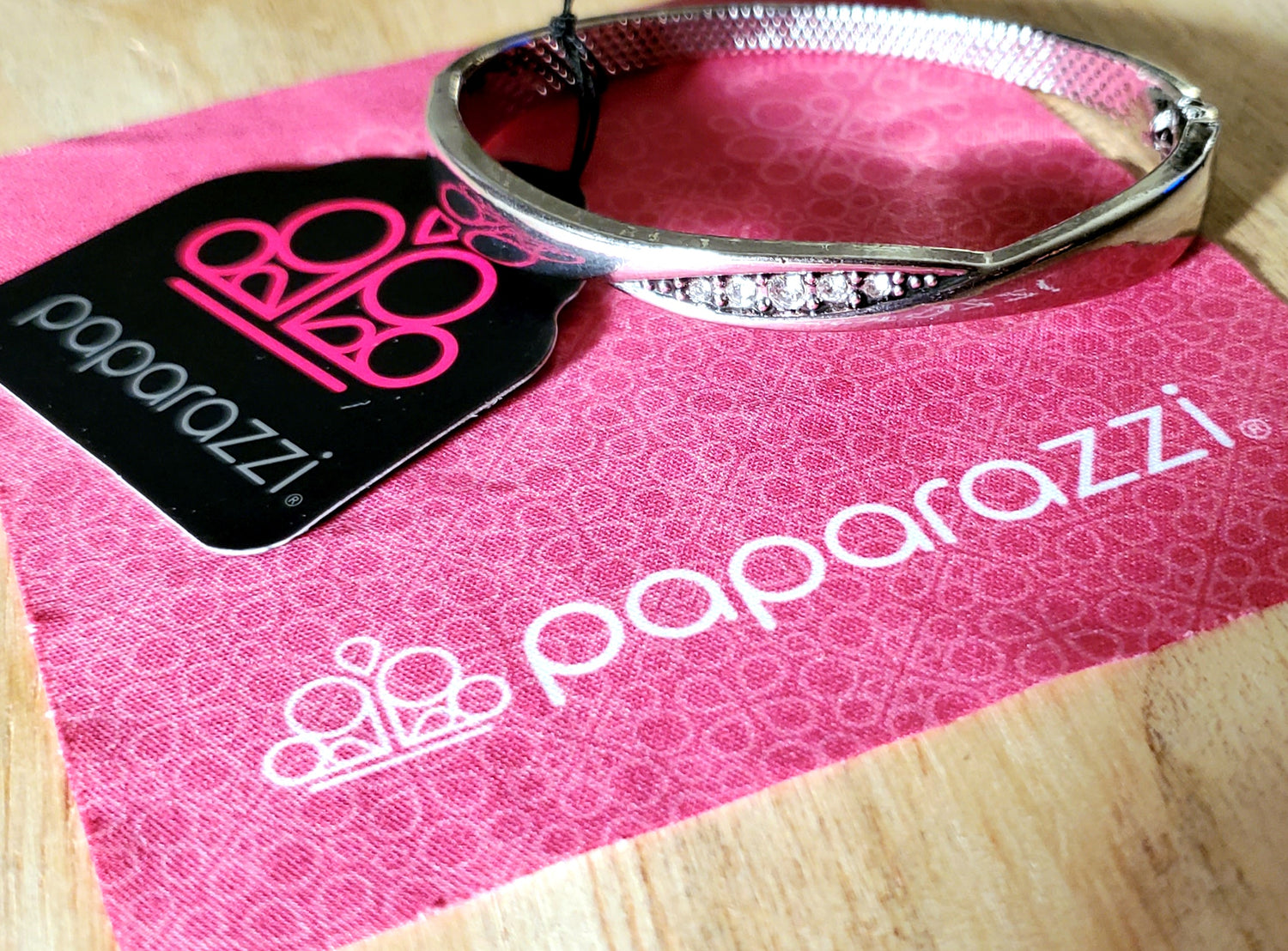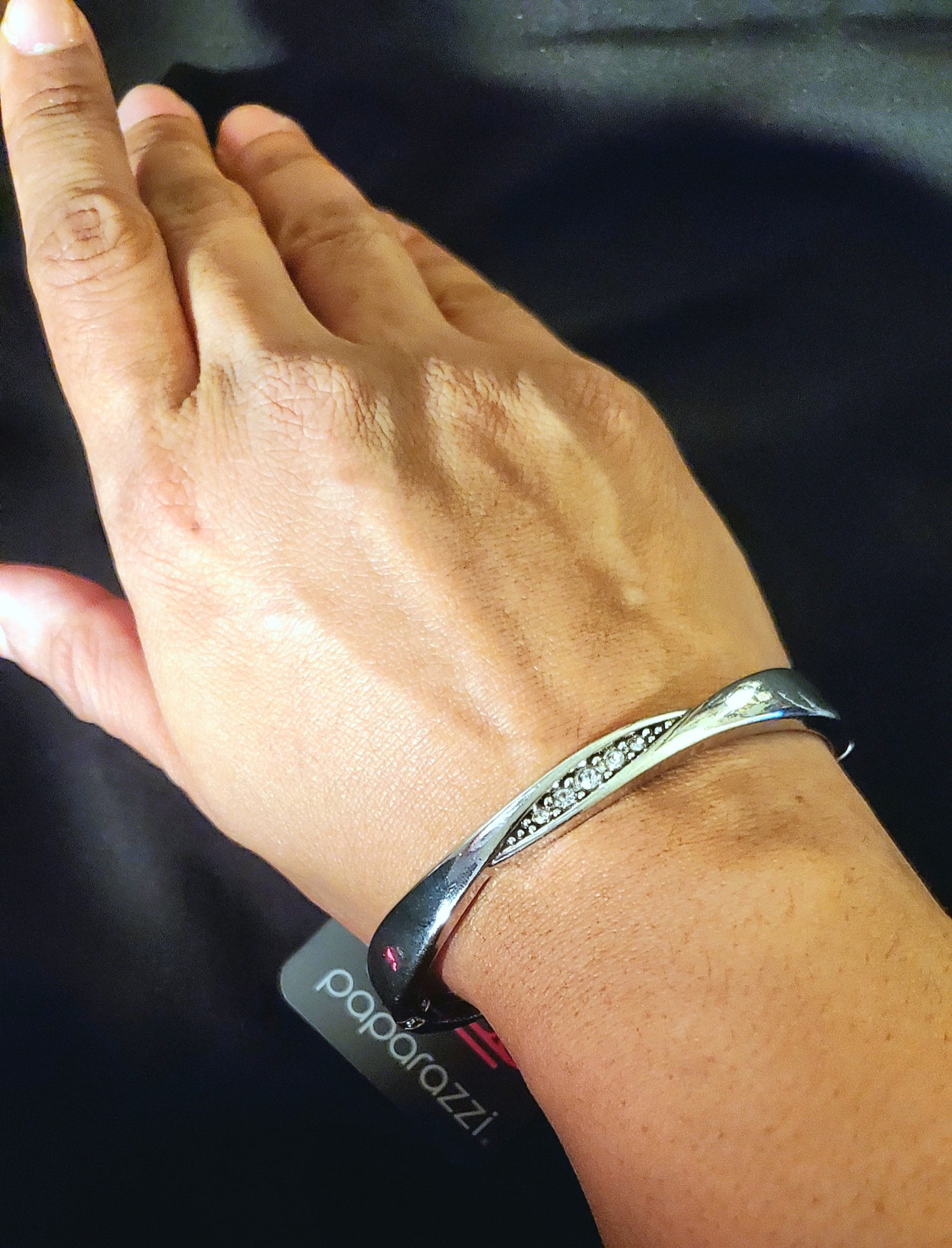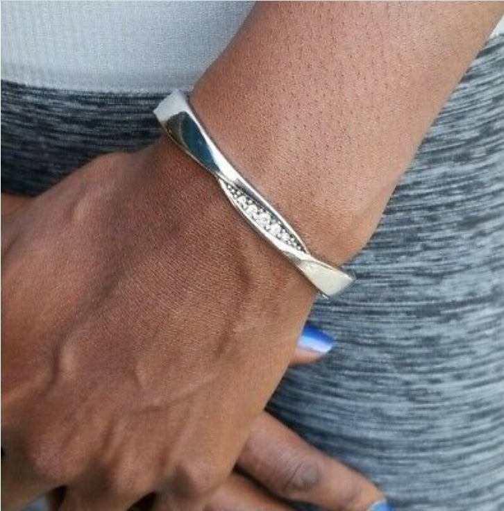 The studded center of a dainty silver bangle-like bracelet is encrusted in a single row of glassy white rhinestones for a refined finish. Features a hinged closure.