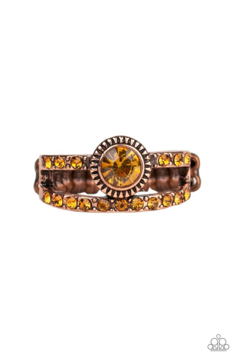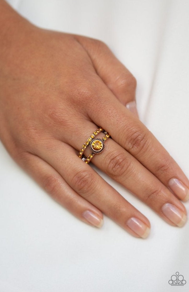 Golden topaz rhinestone encrusted bands arc across the finger, coalescing into a layered band. A glittery topaz rhinestone dots the upper band, creating a refined centerpiece. Features a dainty stretchy band for a flexible fit.
