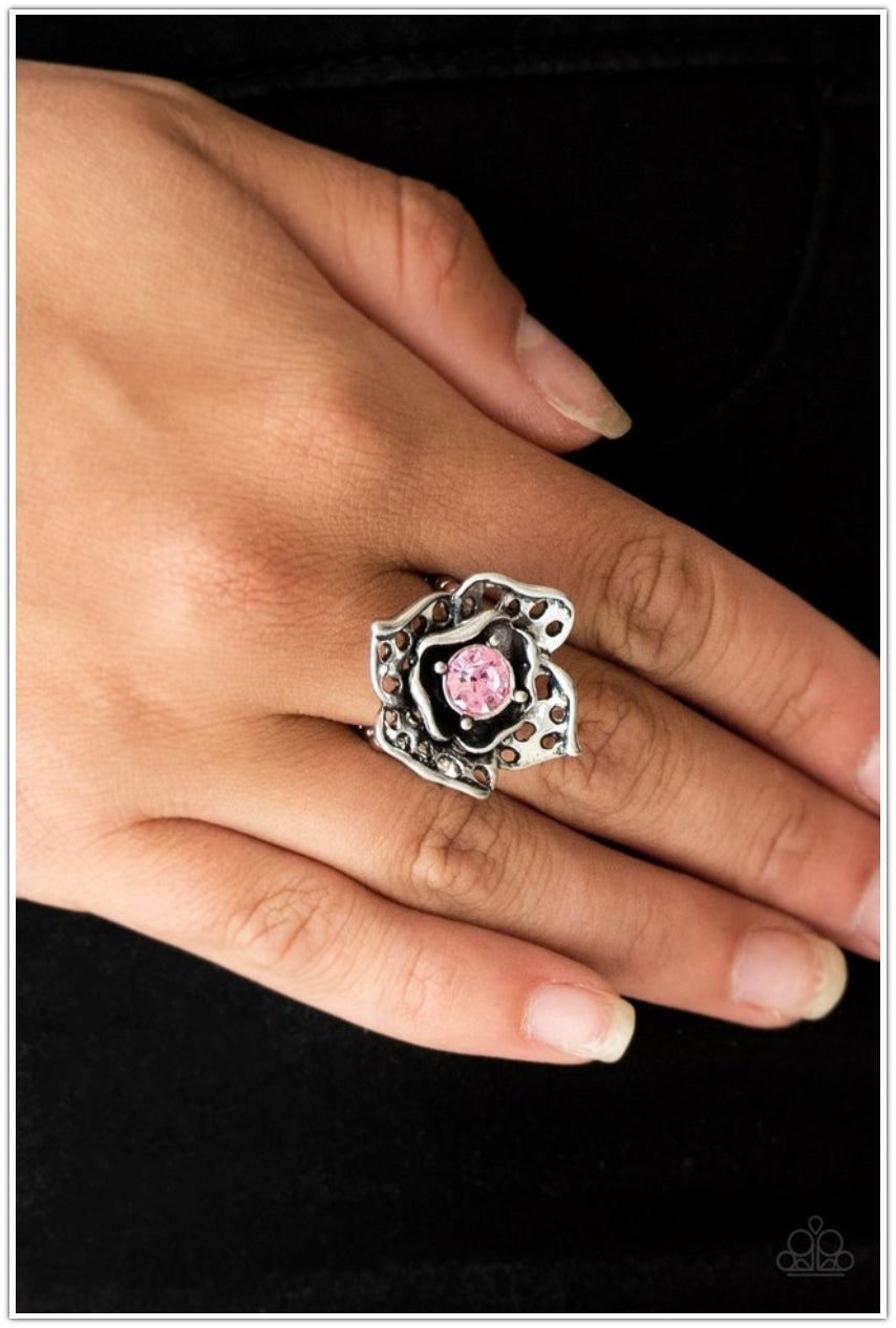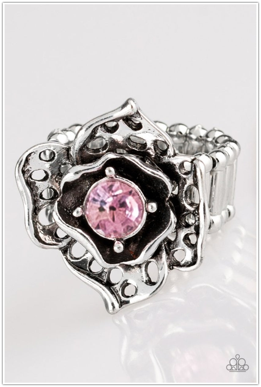 Featuring airy cut-out textures, antiqued silver petals gather around a glowing pink rhinestone center for a whimsical look. Features a stretchy band for a flexible fit.