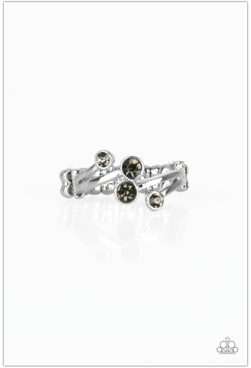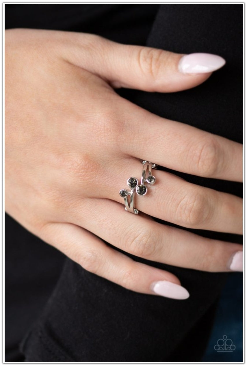 Dotted with smoky rhinestone ends, shiny silver bars fan across the finger. The dainty rhinestones collect at the center for a refined flair. Features a dainty stretchy band for a flexible fit.