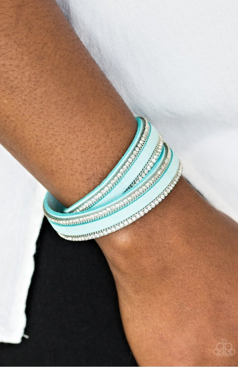 An elongated blue suede band is encrusted in rows of glassy white rhinestones and shimmery silver chains. The elongated band double wraps around the wrist for a fierce one-of-a-kind look. Features an adjustable snap closure.