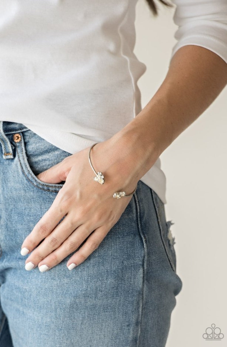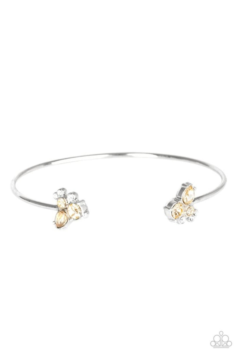Varying in shape, golden topaz and glitter white rhinestones join at both ends of a dainty silver cuff, creating refined fittings.