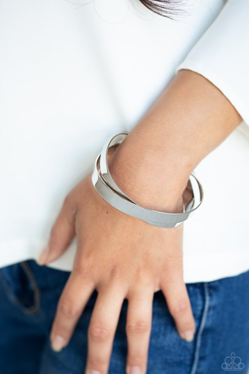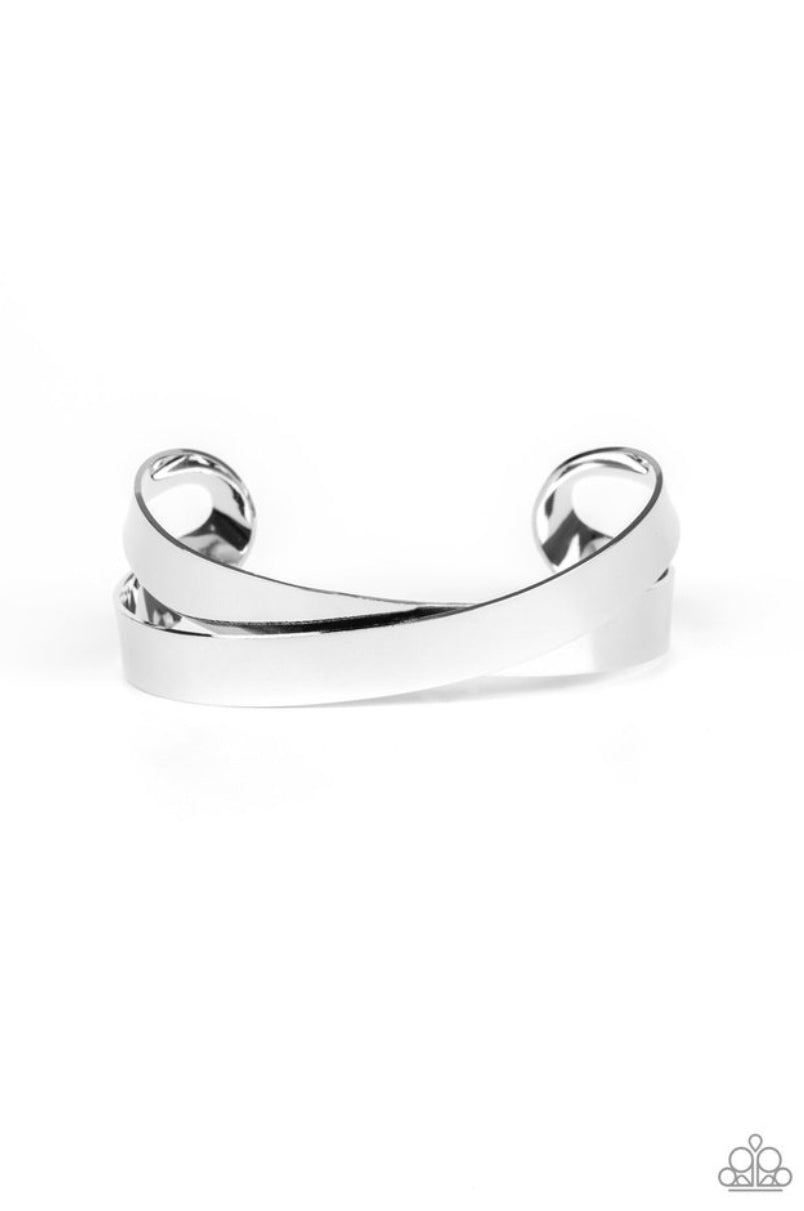 A flat silver ribbon delicately crisscrosses across the wrist, coalescing into an edgy cuff.