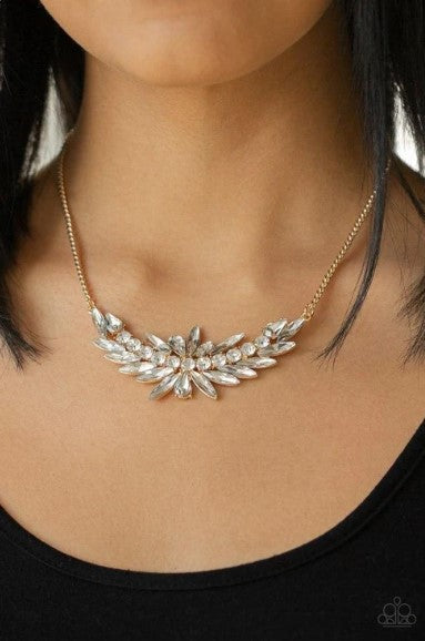 Featuring round, marquise, and teardrop style cuts, a glassy collection of glittery white rhinestones coalesce into a blinding gold pendant below the collar. Features an adjustable clasp closure.