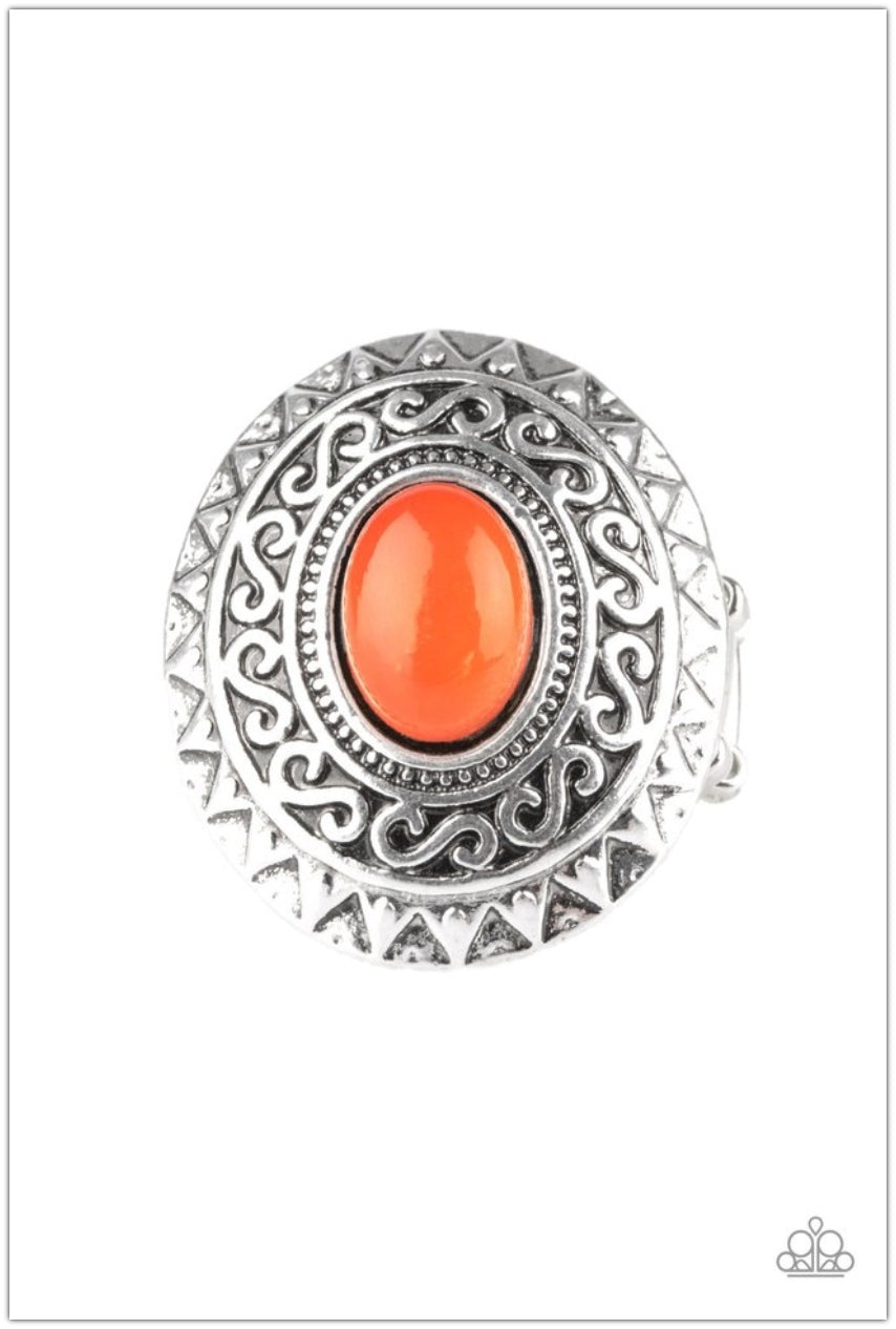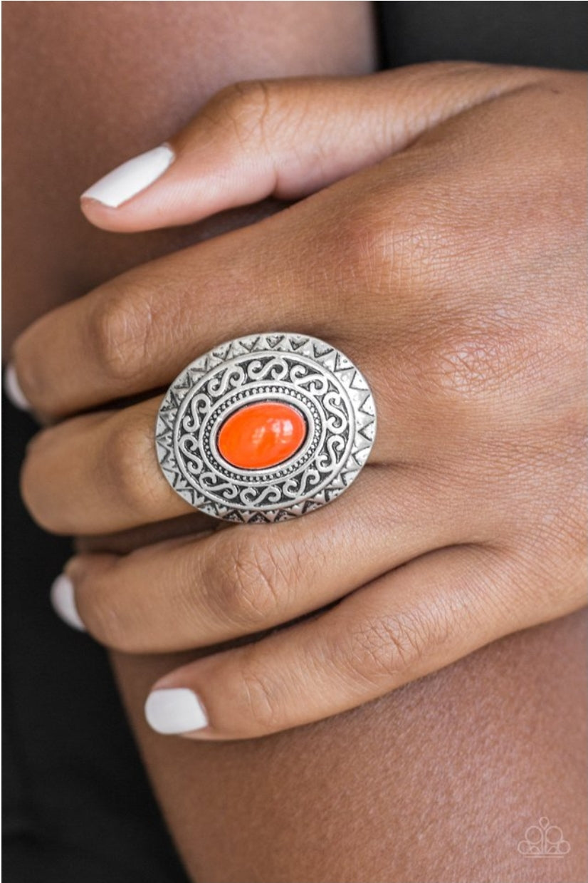 A glowing orange stone is pressed in the center of a dramatic silver frame radiating with shimmery sunburst details for a seasonal look. Features a stretchy band for a flexible fit.