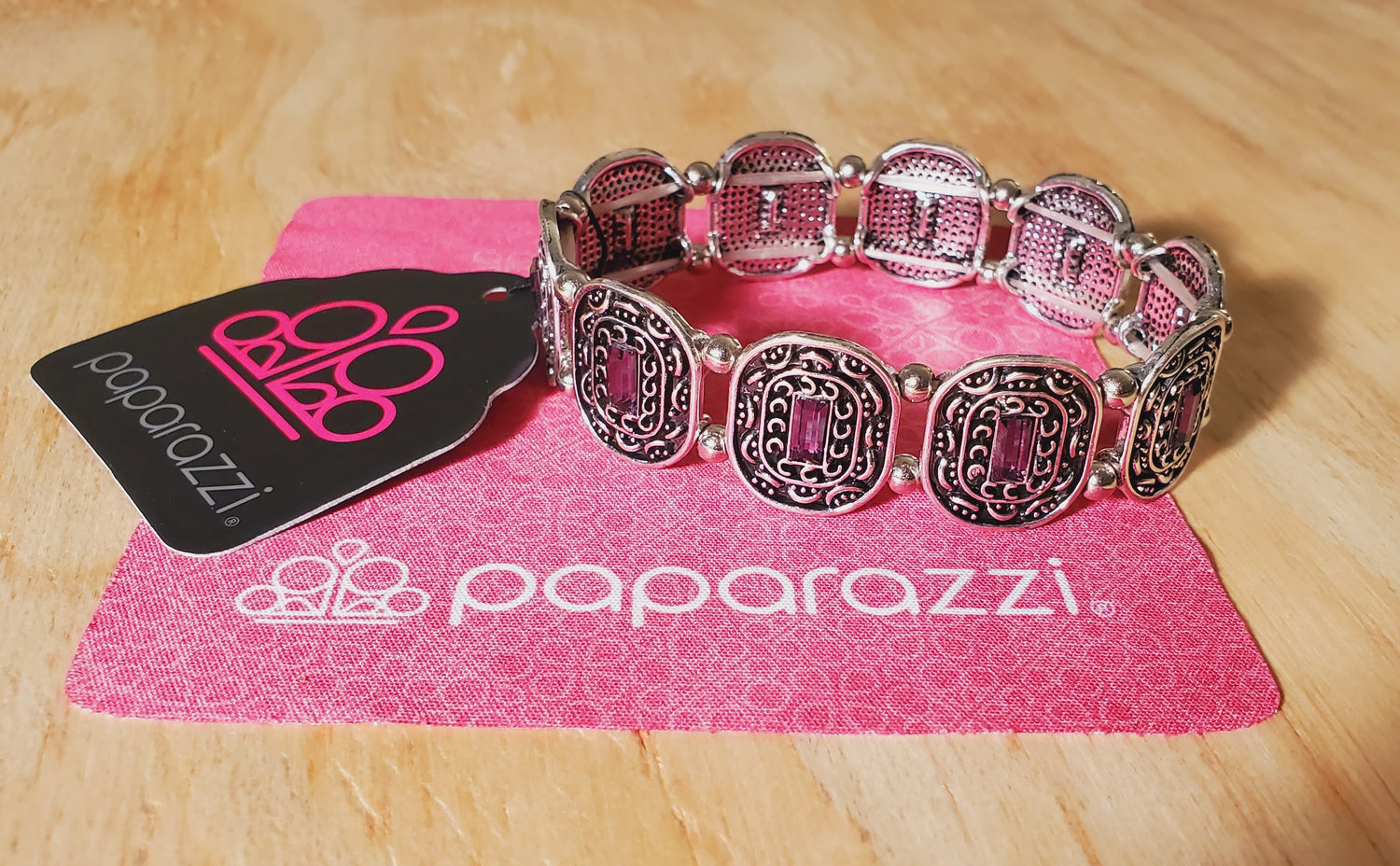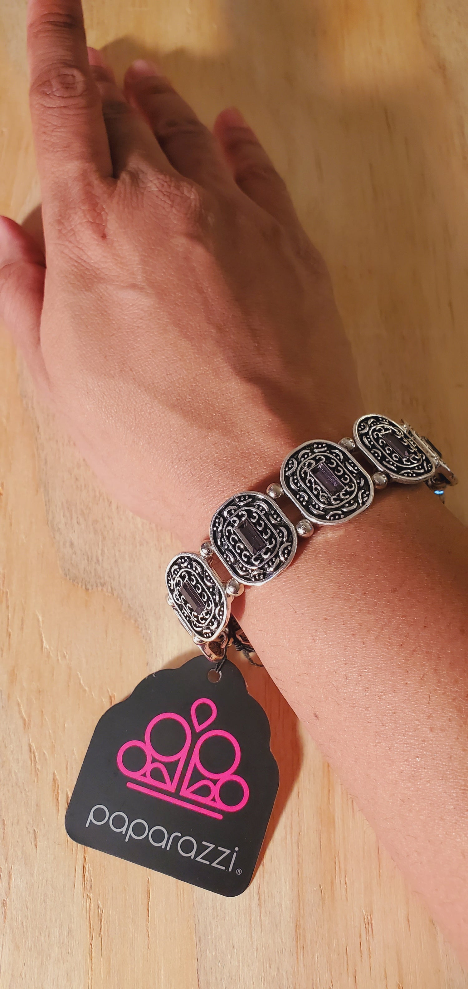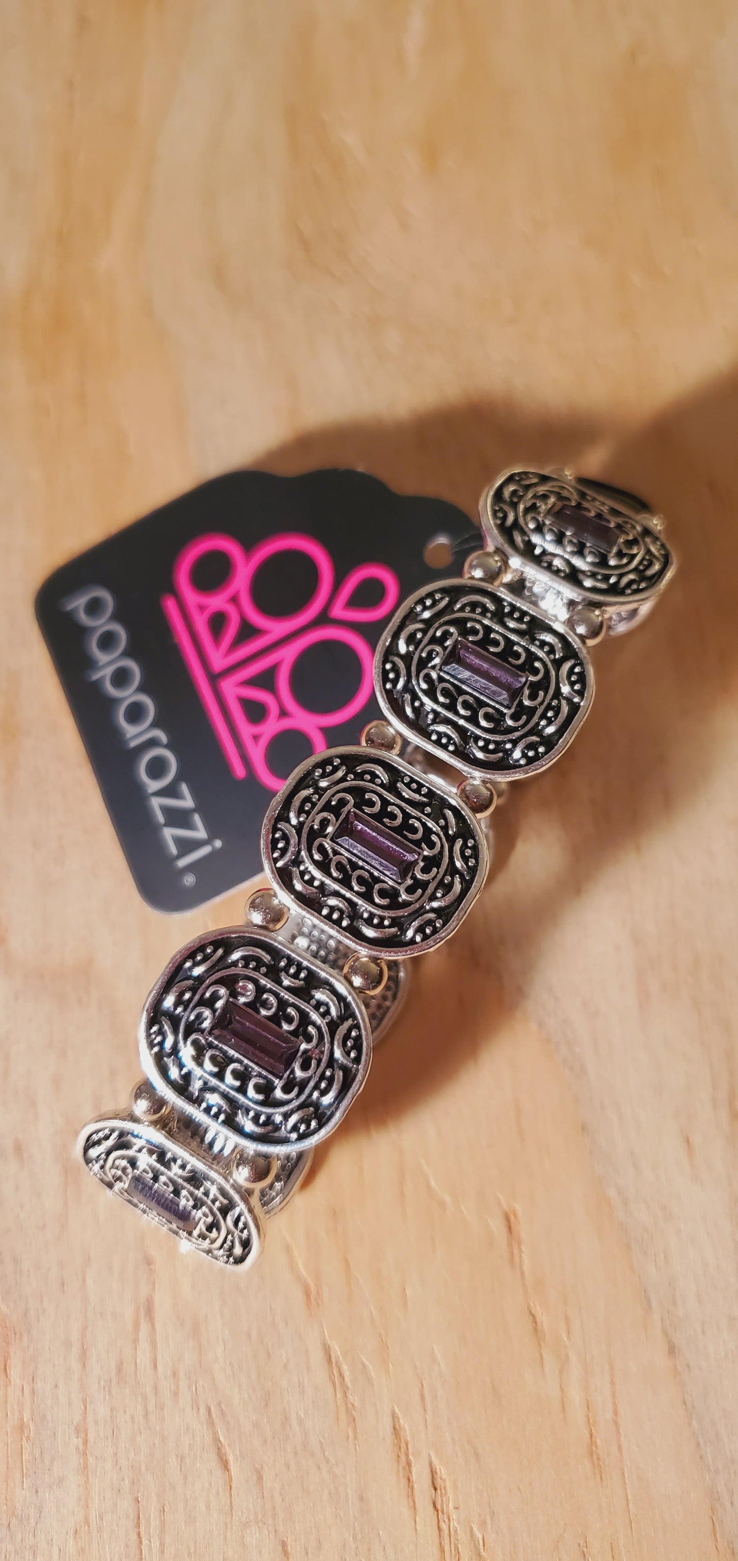 Faceted petite purple gems are pressed into the centers of silver frames. The ornate frames are threaded along elastic stretchy bands, alternating with silver beads and creating a whimsical look around the wrist.