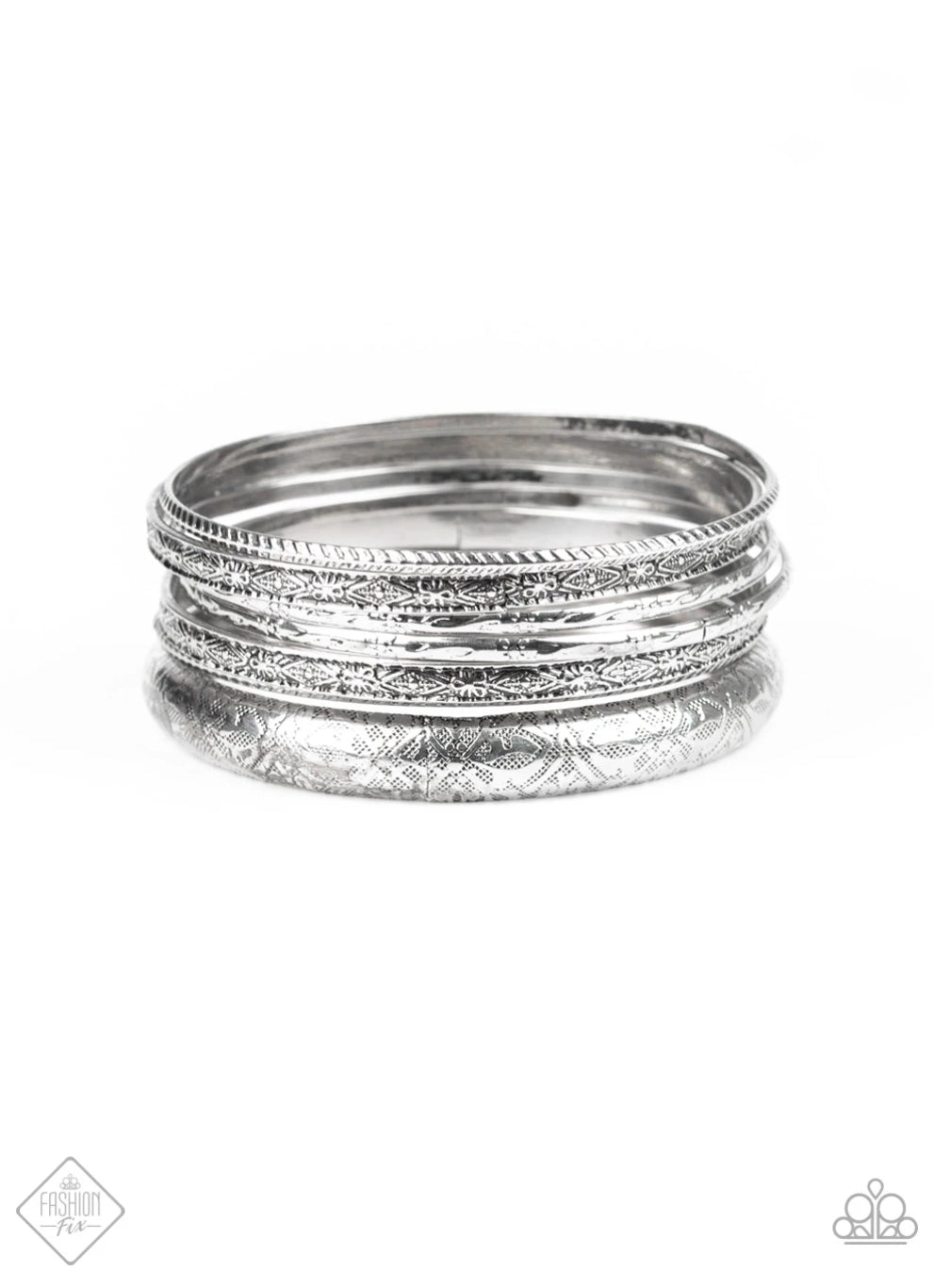 Featuring an array of floral and tribal inspired patterns, a collection of mismatched silver bangles slide along the wrist for a seasonal look.