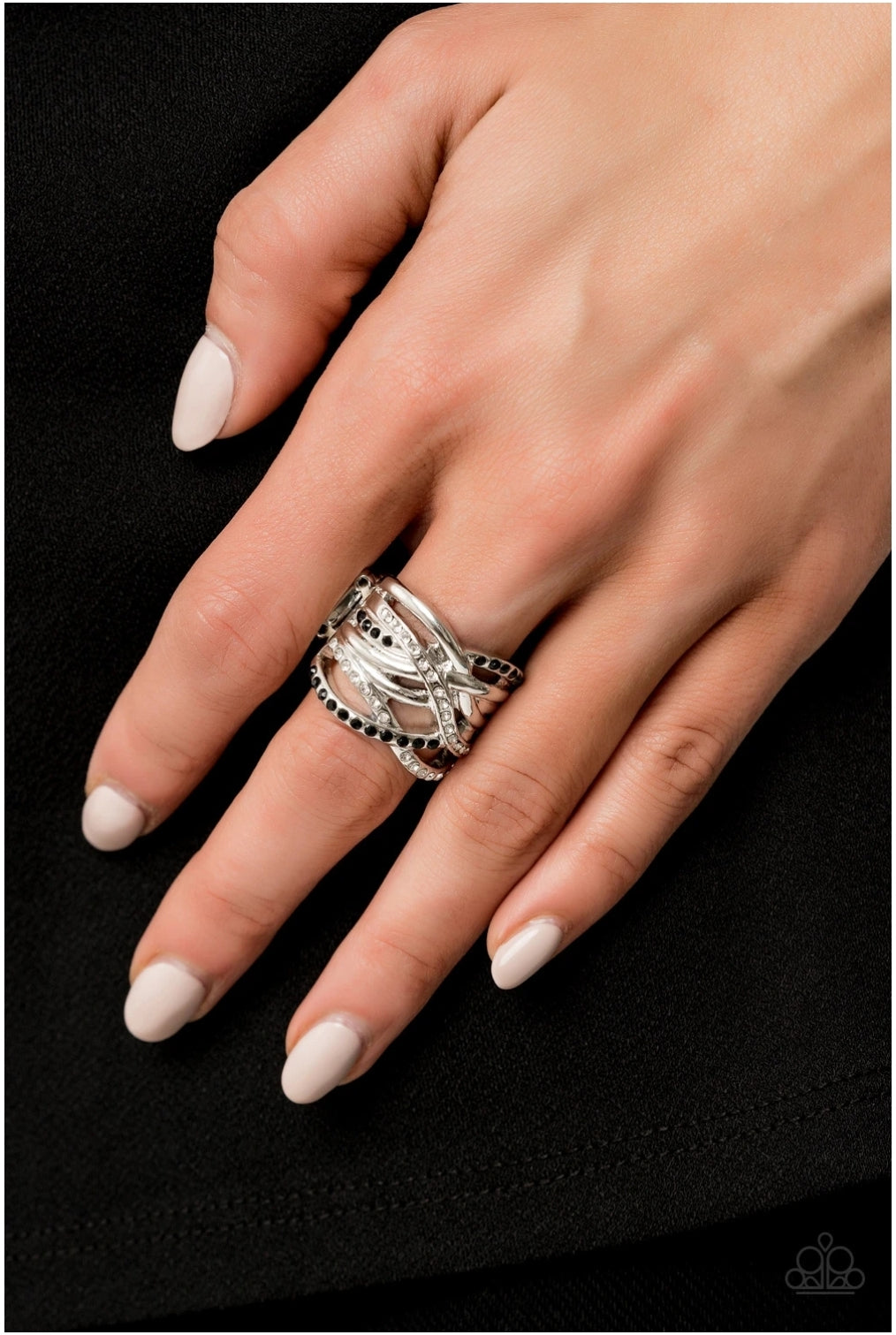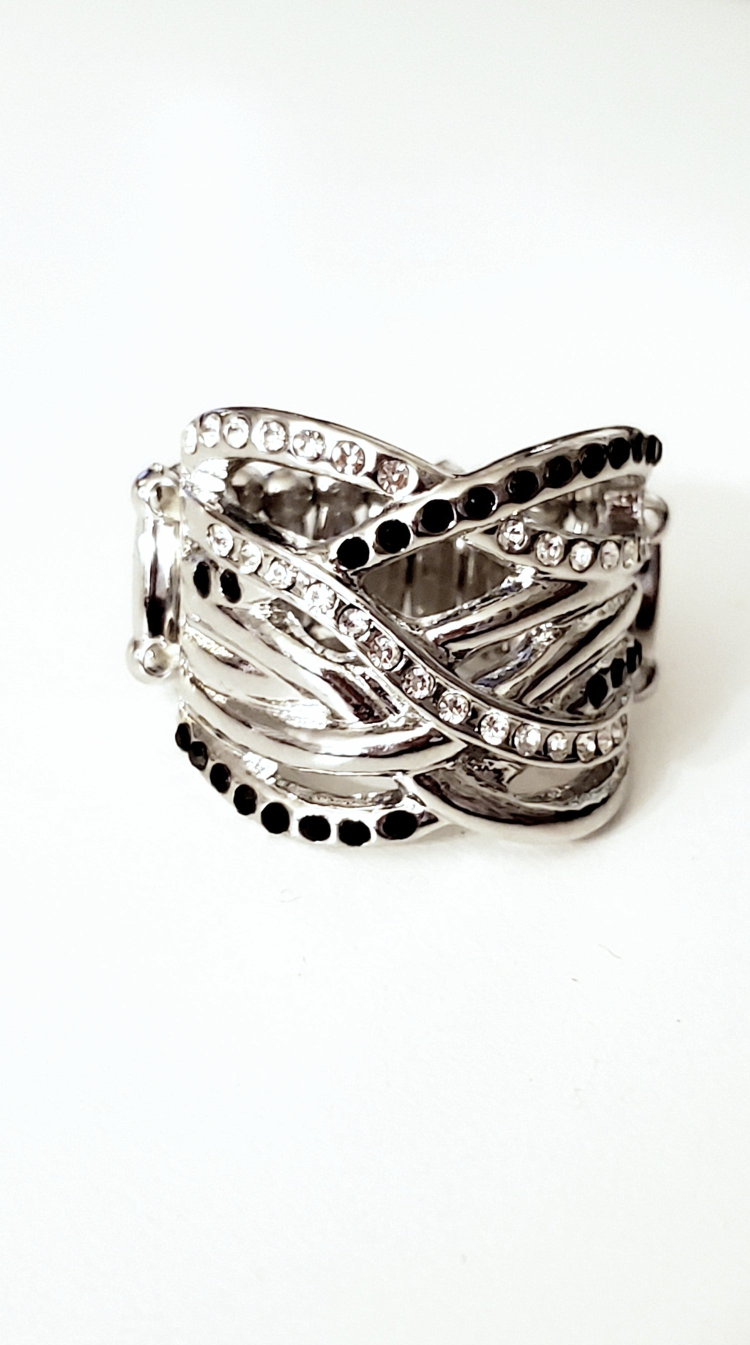 Encrusted in sporadic rows of glittery black and white rhinestones, glistening silver bars race across the finger, creating stacked shimmer. Features a stretchy band for a flexible fit.