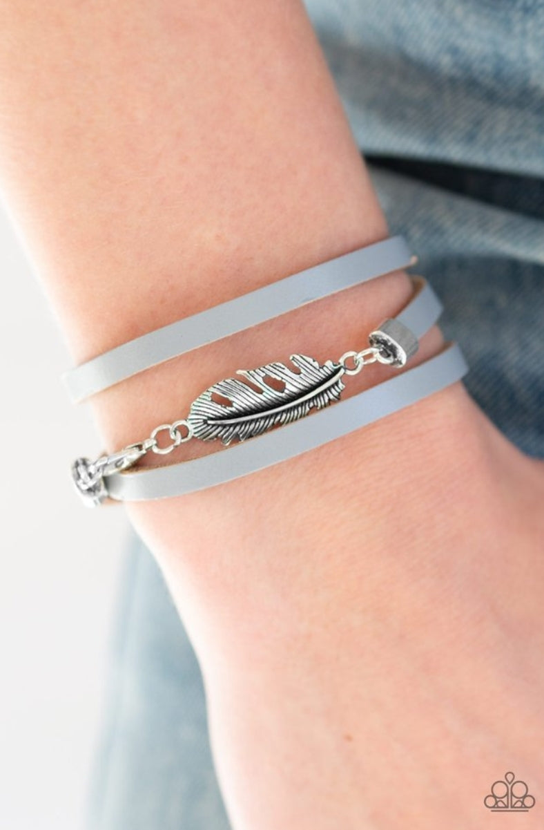 Infused with a shimmery silver feather charm, an elongated strip of gray leather triple wraps around the wrist for a wanderlust flair. Features a clasp closure.