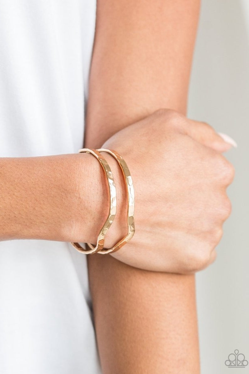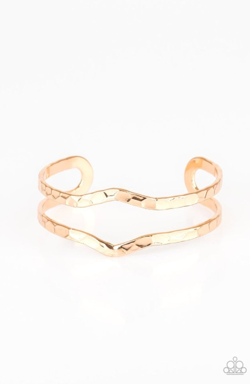 Delicately hammered in shimmer, glistening gold bars arc across the wrist, coalescing into an airy cuff.