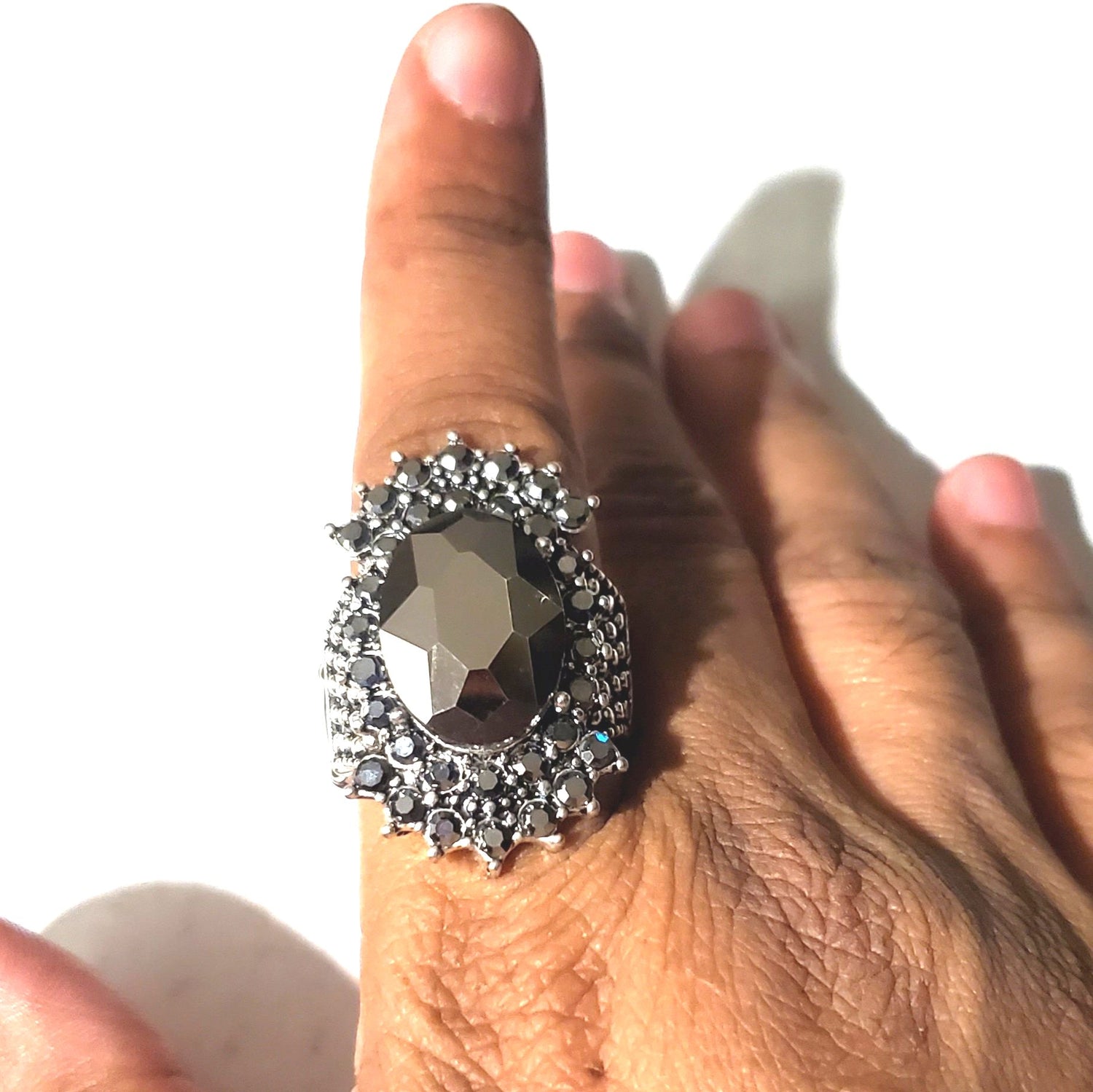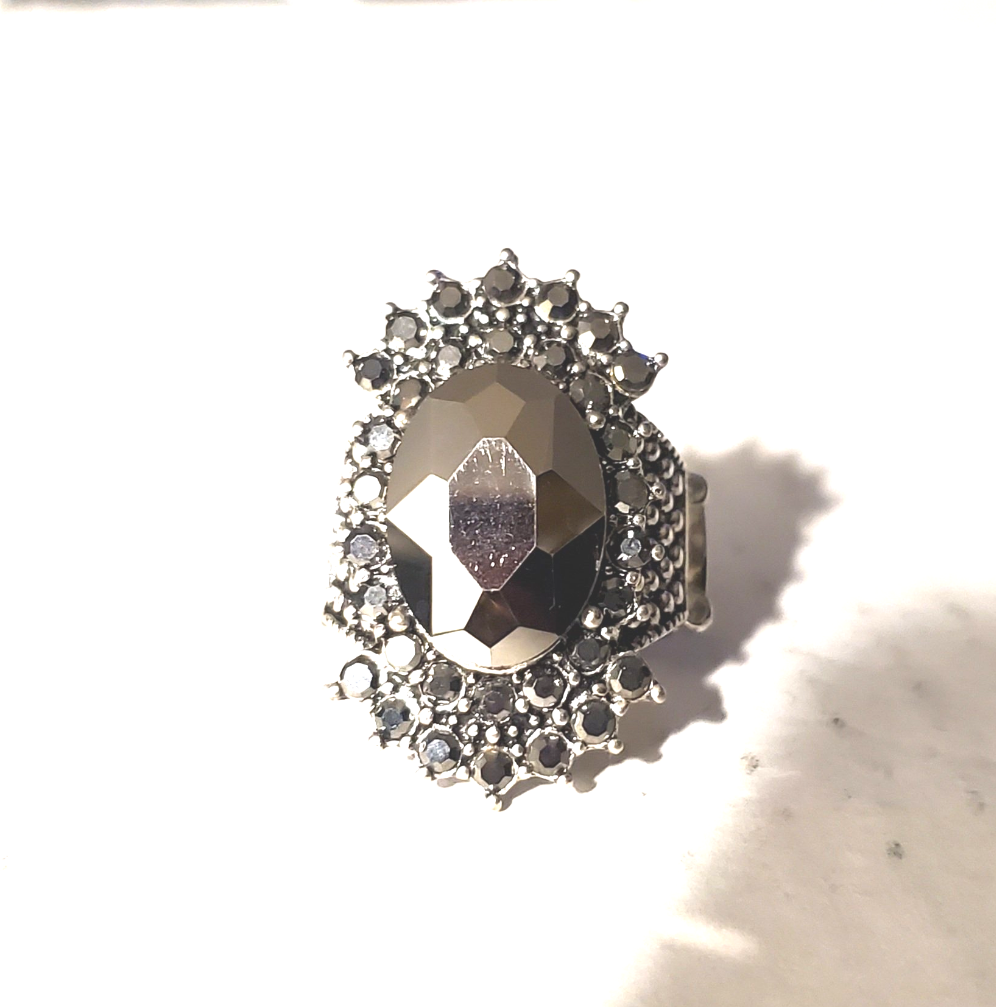 Featuring an ornate-style cut, a faceted hematite gem is pressed into the center of a silver frame radiating with smoky hematite rhinestones. Features a stretchy band for a flexible fit.