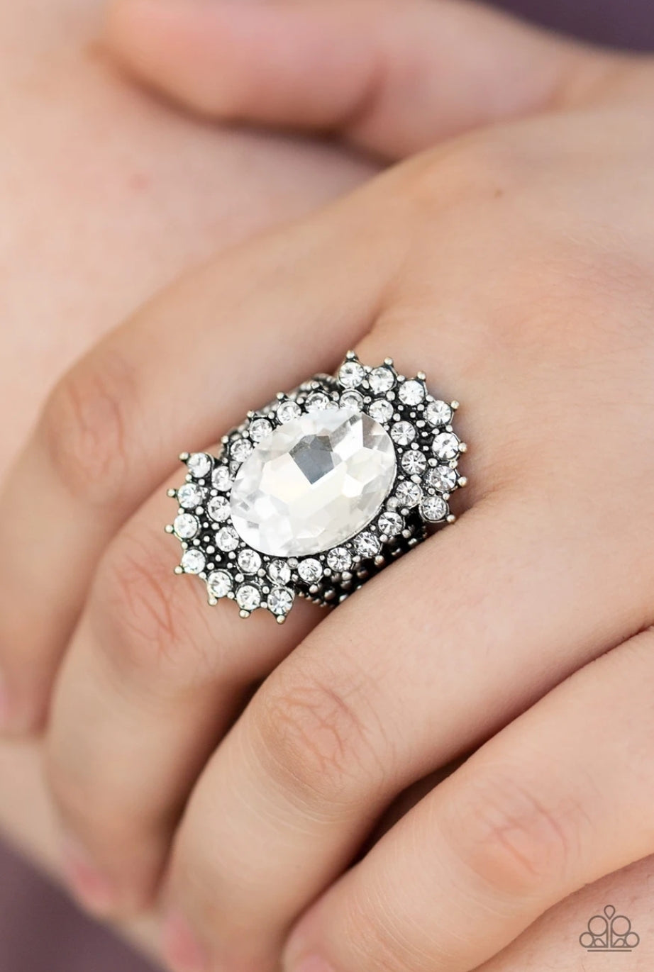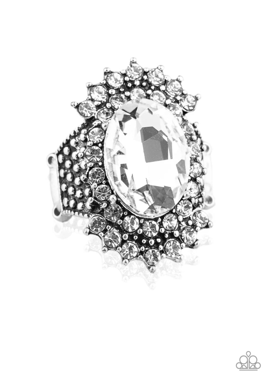 Glittery white rhinestones flare out from a dramatically oversized white rhinestone center. The regal frame sits atop a silver studded band for a statement-making finish. Features a stretchy band for a flexible fit.