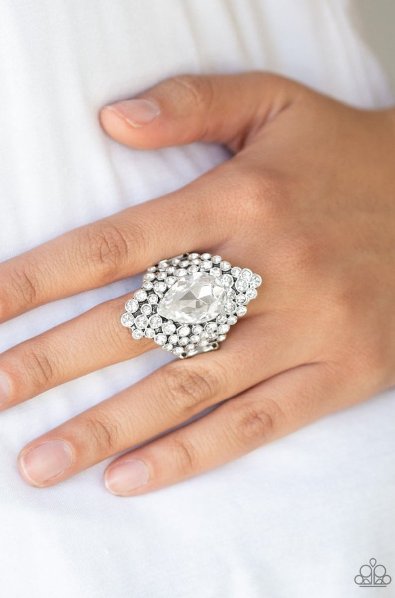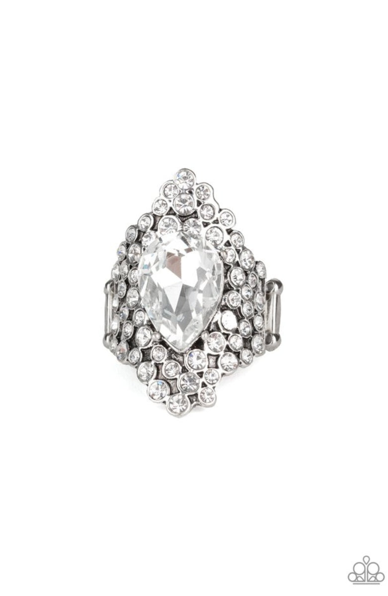Featuring a regal teardrop cut, a glittery white gem is pressed into the center of a sparkling backdrop of glassy white rhinestones, creating a blinding centerpiece atop the finger. Features a stretchy band for a flexible fit.