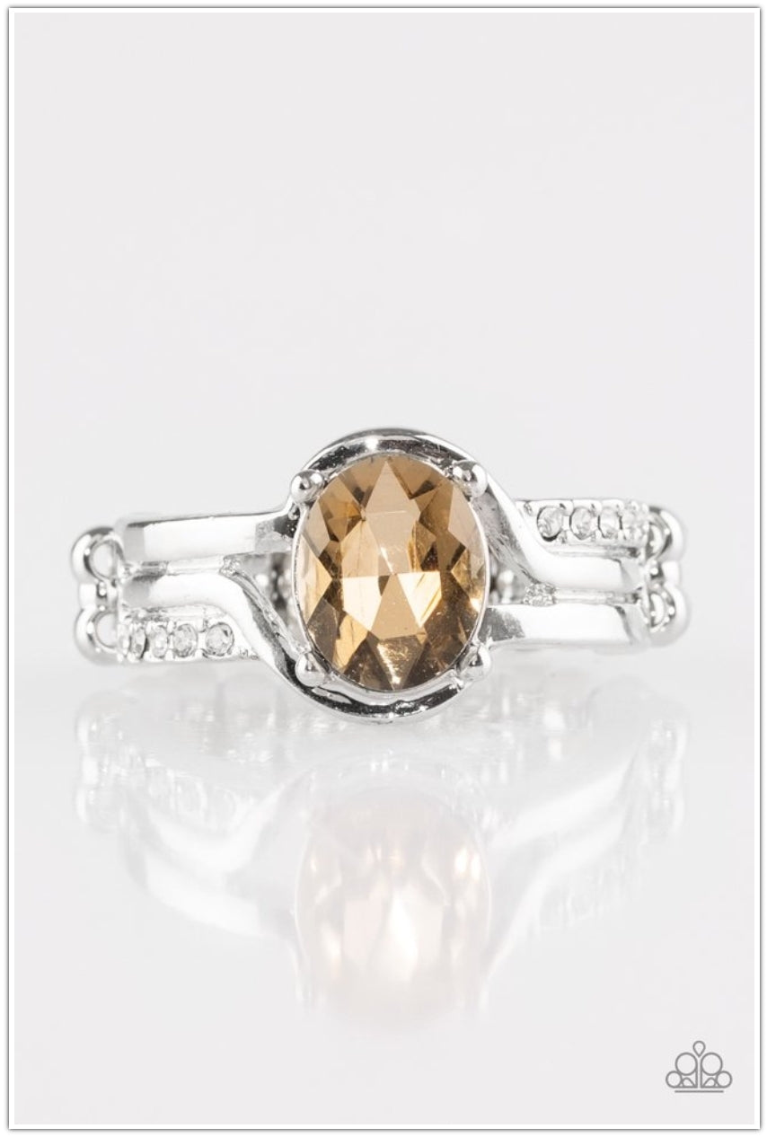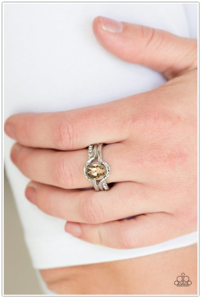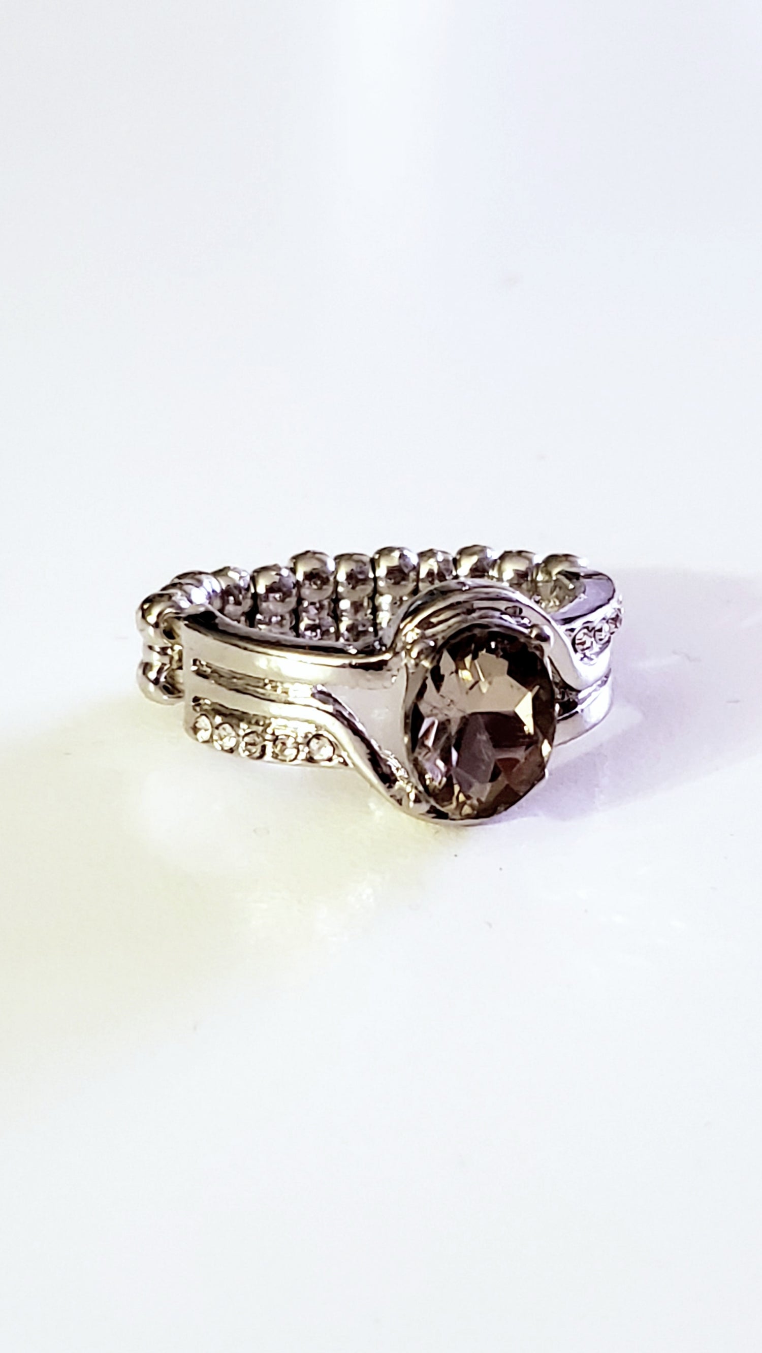 Glistening silver bands fold around a golden brown gem, creating a regal centerpiece. Sections of dainty white rhinestones encrust the outer-bands for a timeless finish. Features a dainty stretchy band for a flexible fit.