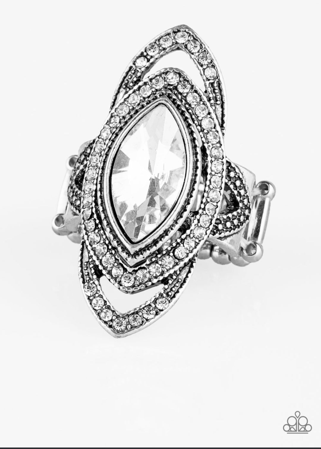 Encrusted in glassy white rhinestones, a glittery silver band encircles an oversized marquise style rhinestone for a dramatic look. Features a stretchy band for a flexible fit.