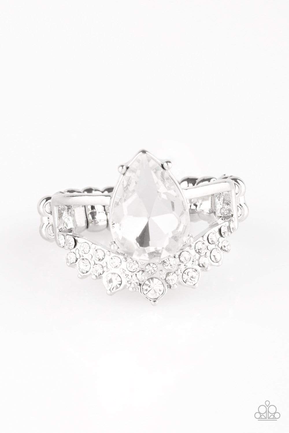 A shiny silver bar and white rhinestone encrusted bar arc across the finger, coalescing into an airy band. Featuring a regal teardrop cut, a glittery white rhinestone is pressed into the bands for a statement making finish. Features a dainty stretchy band for a flexible fit.