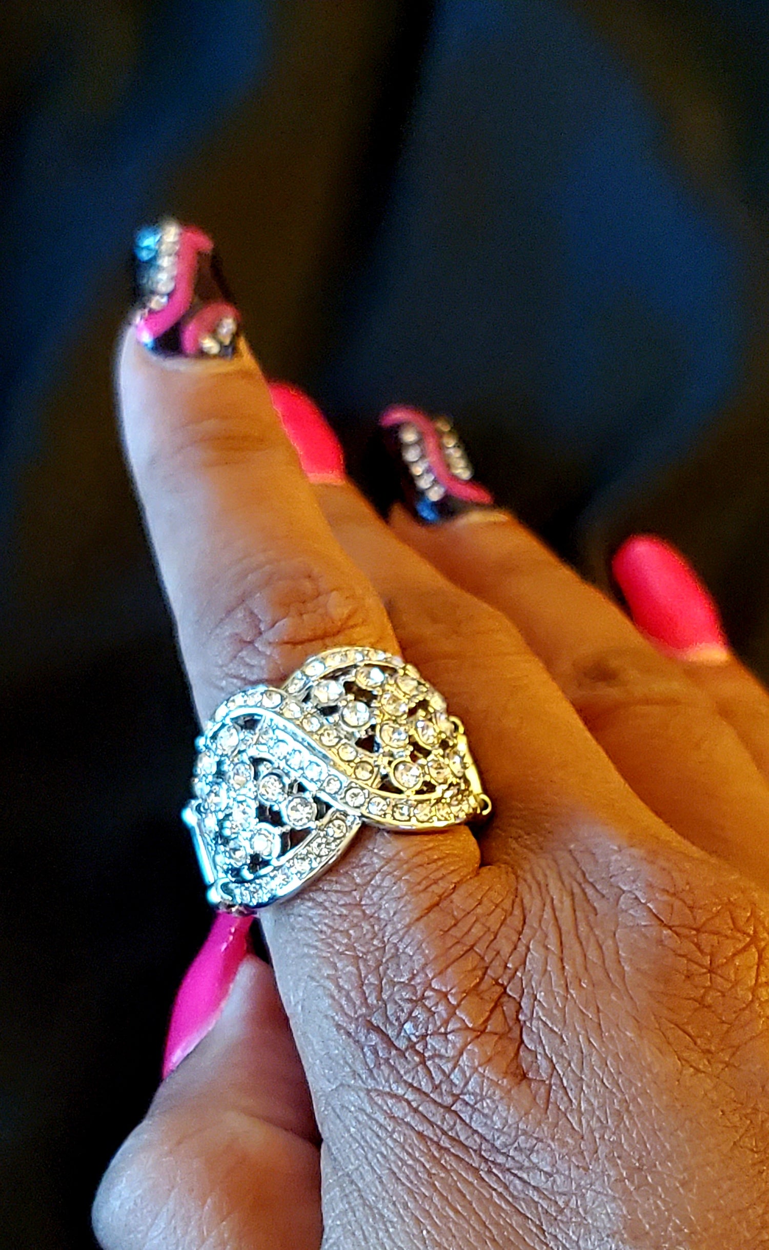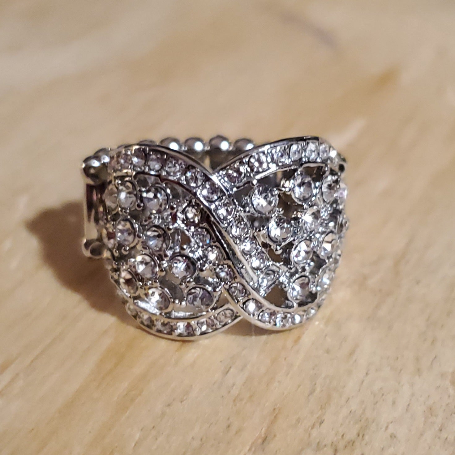 Silver ring with white rhinestones. stretchy band.