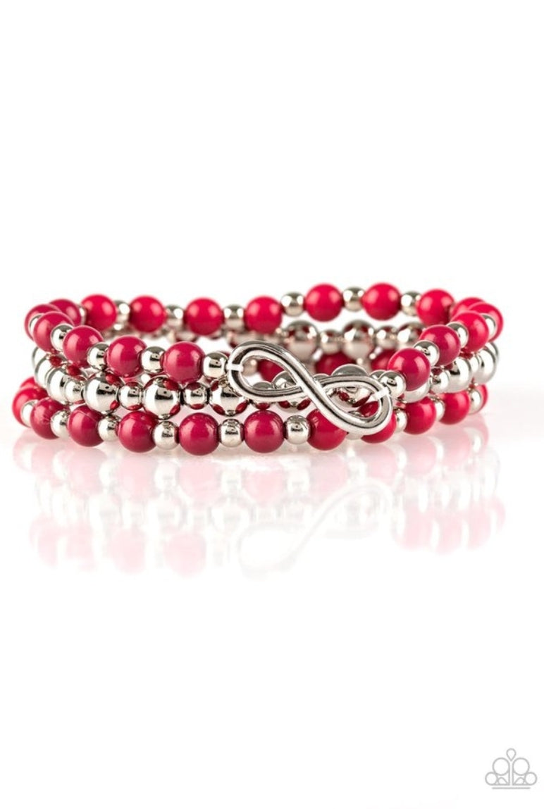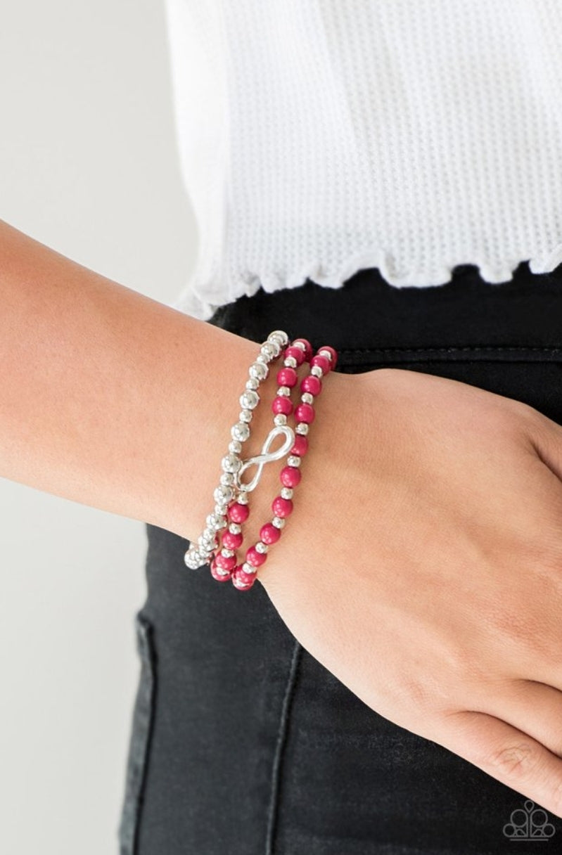 Vivacious pink and shiny silver beads are threaded along stretchy bands, creating colorful layers around the wrist. A dainty silver infinity charm adorns one strand for a whimsical finish.