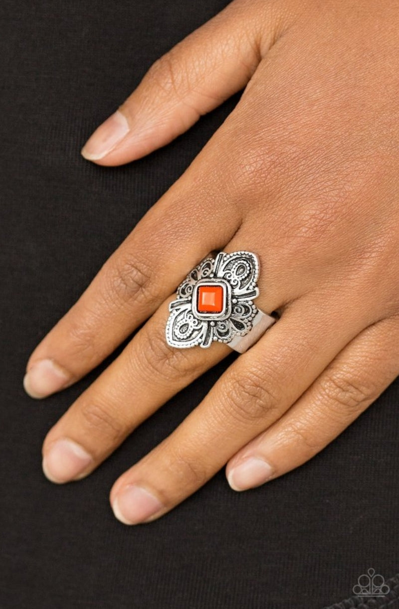 An orange square bead is pressed into the center of a scalloped silver frame radiating with tribal inspired detail for a seasonal look. Features a stretchy band for a flexible fit.