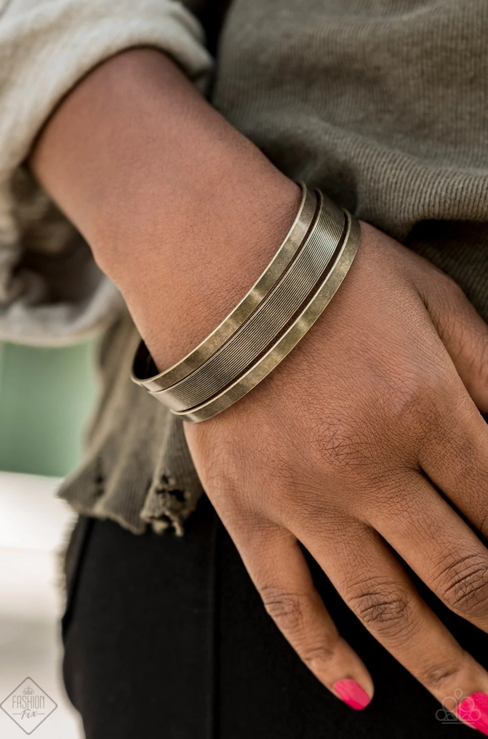 Bracelet: "Big Mash Up" - Featuring antiqued finishes and gritty linear patterns, a collection of brass bangles stacks across the wrist for a rustic look.