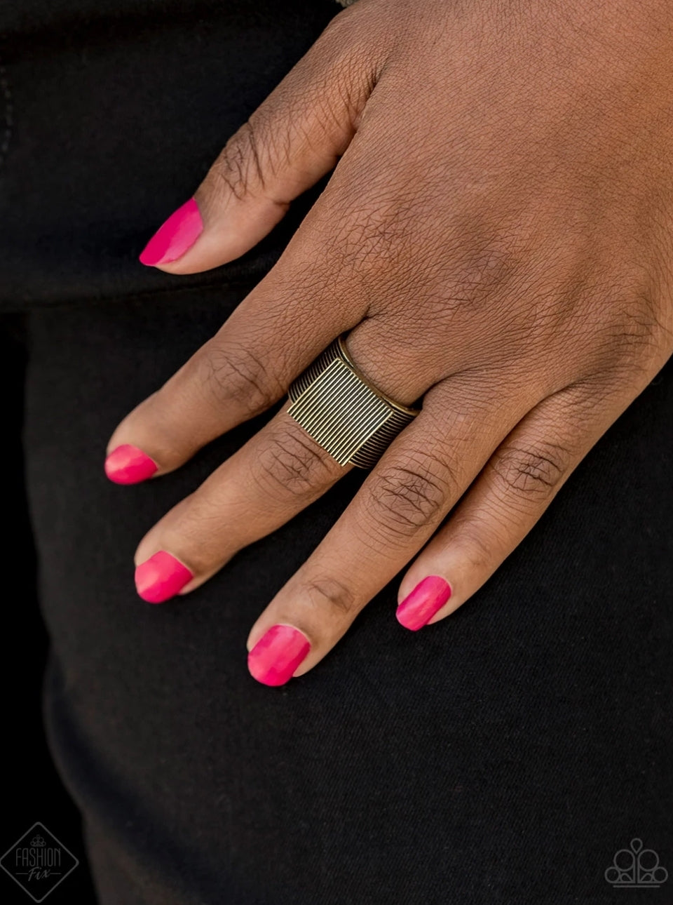 Ring: "In GRATE Measure" - Etched in linear texture, a bold brass square sits atop a thick brass band radiating with alternating linear patterns, creating an edgy centerpiece. Features a stretchy band for a flexible fit.