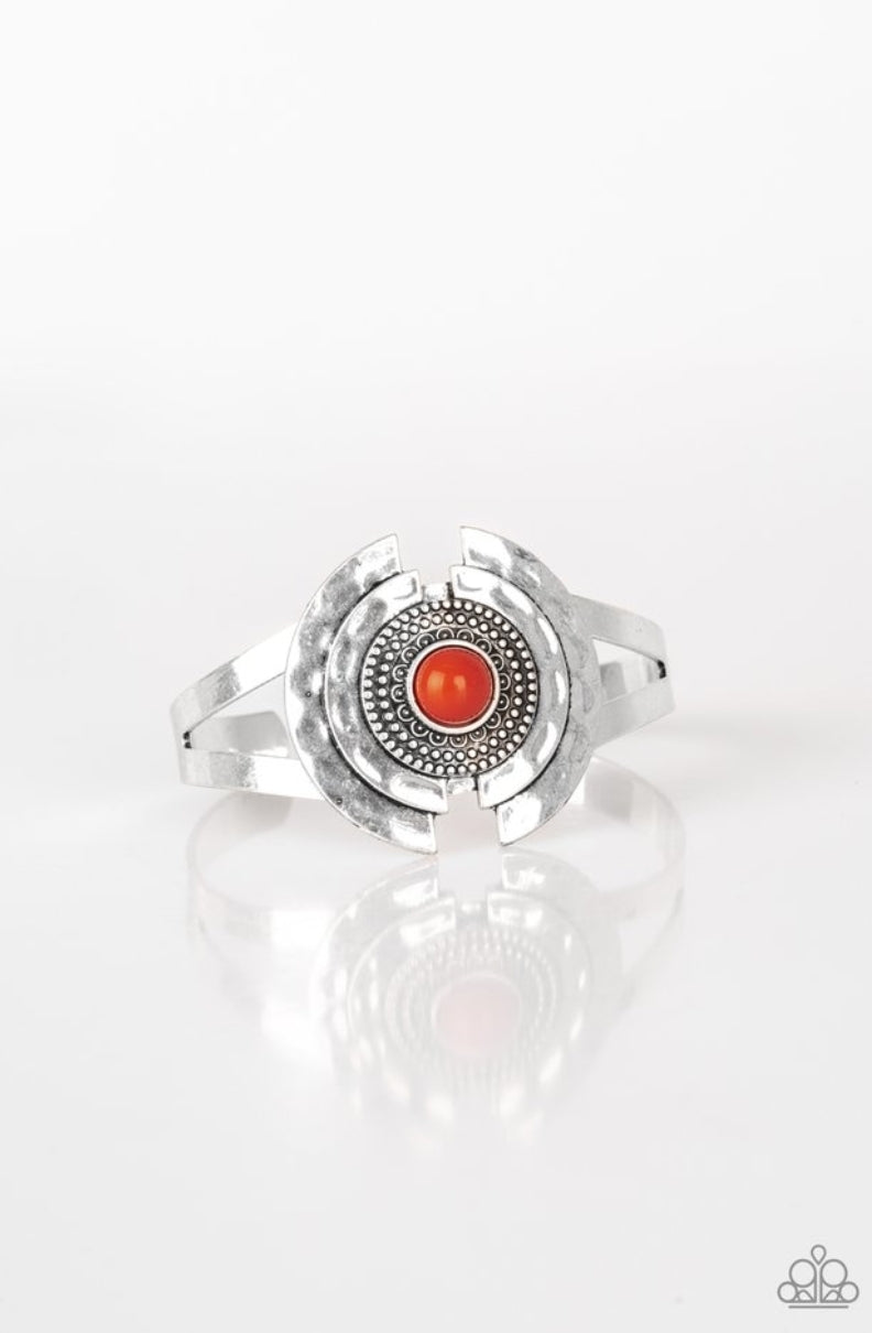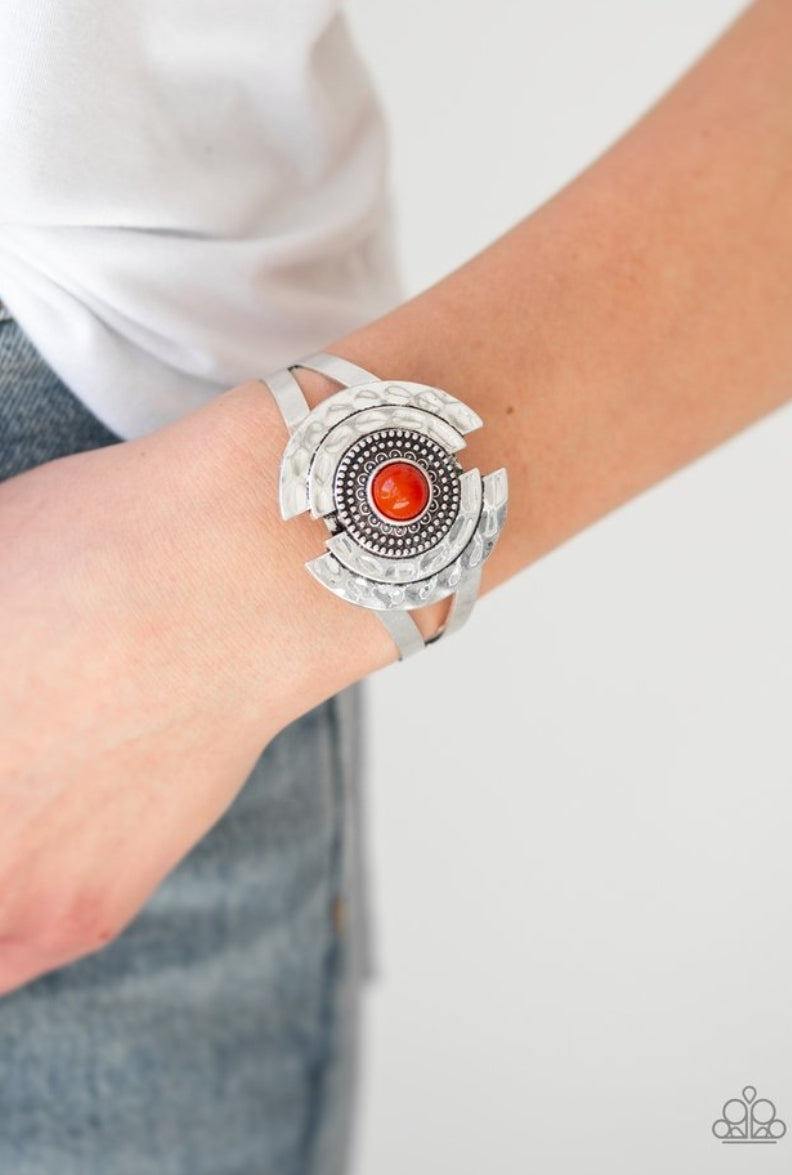 A refreshing orange bead is pressed into the center of a hammered and studded silver floral frame atop an antiqued cuff for a seasonal look.