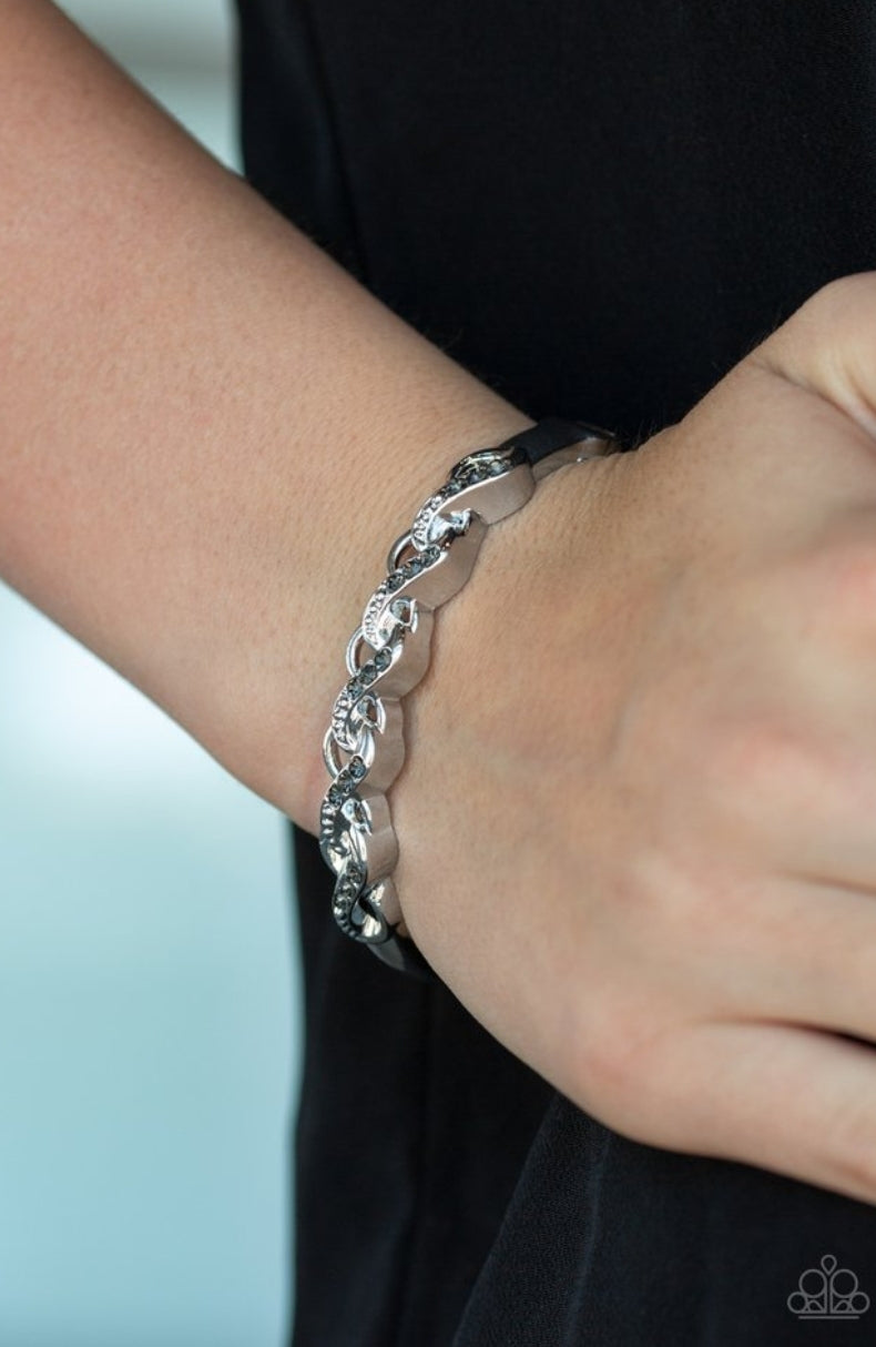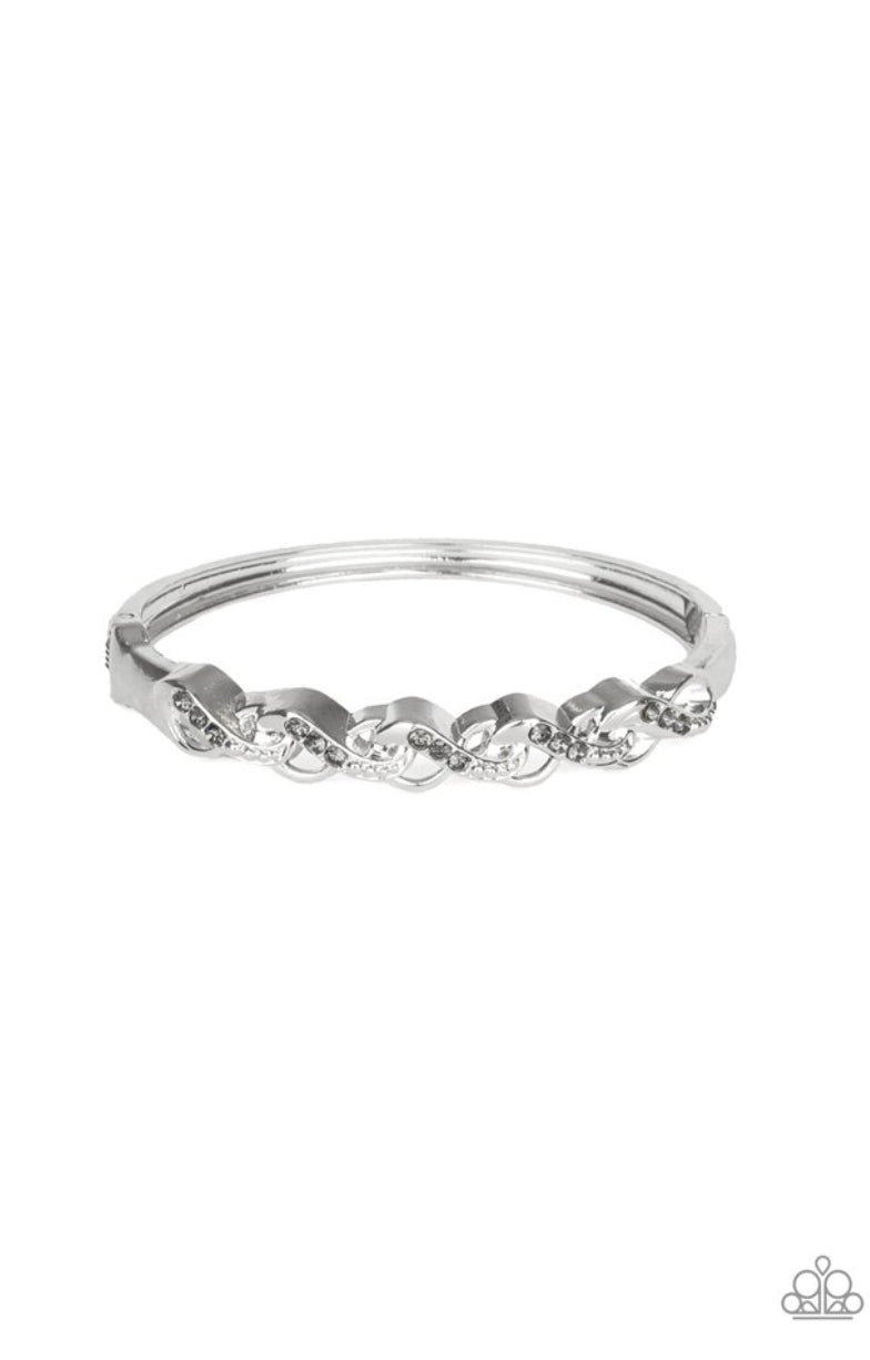 Dotted with sections of shimmery silver studs and smoky rhinestones, glistening silver ribbons braid into interwoven infinity frames across the wrist for a timeless look. Features a hinged clasp.