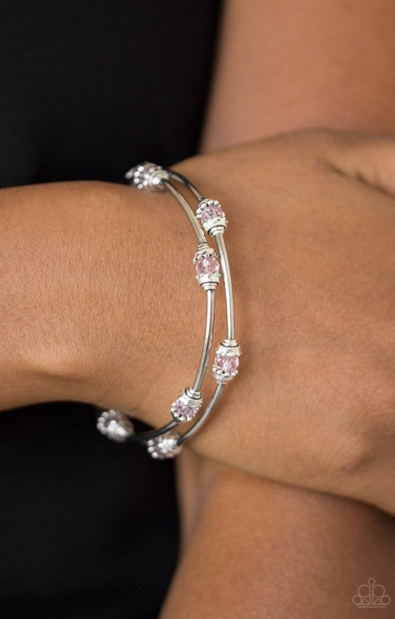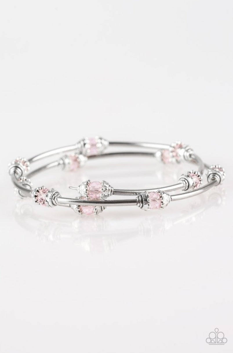 Dainty pink crystal-like beads and shimmery silver accents alternate along a coiled wire to create a refined infinity wrap style bracelet.
