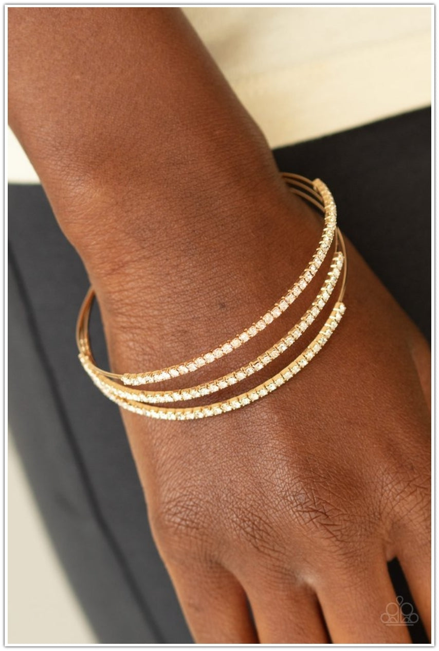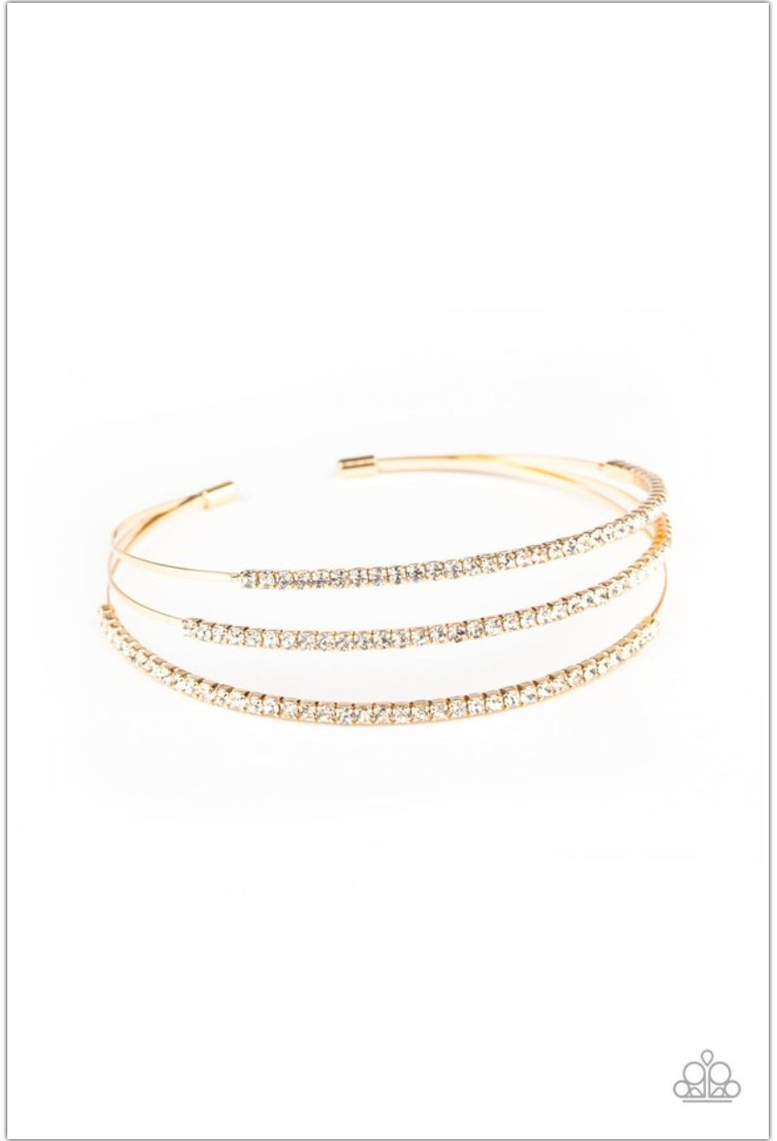 Sections of glittery white rhinestones are encrusted along the tops of three dainty gold bars that coalesce into a glitzy cuff around the wrist.