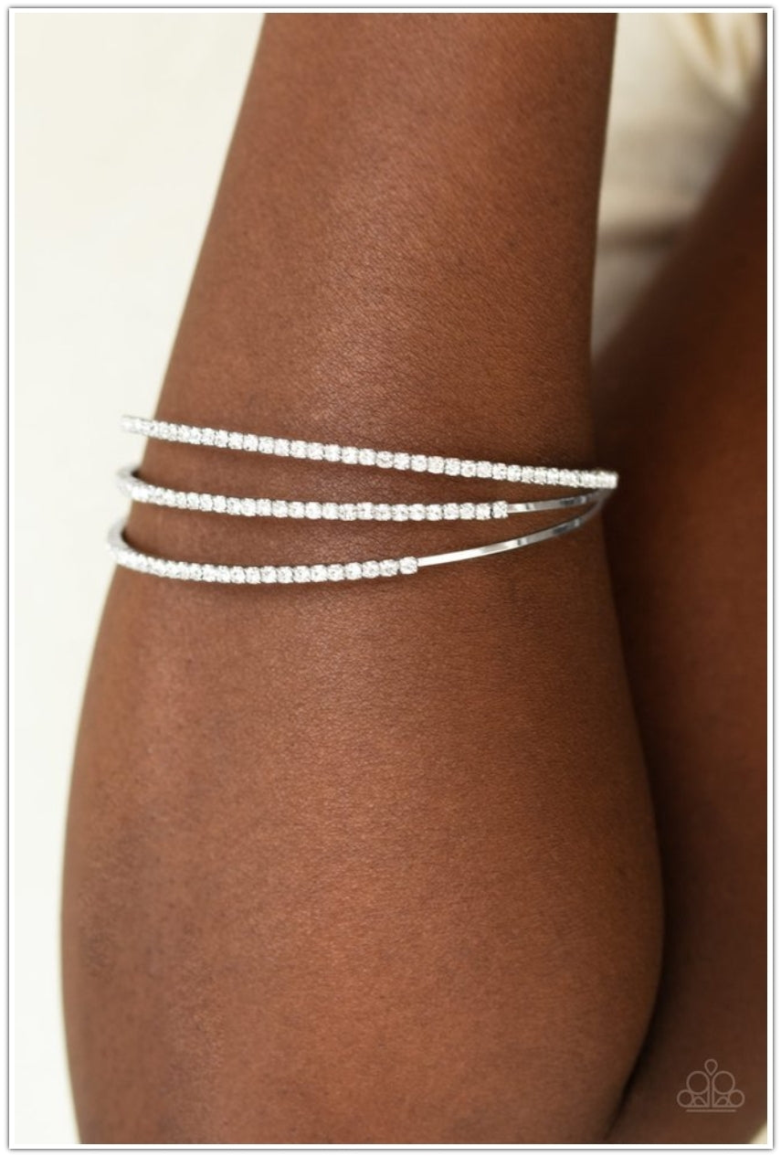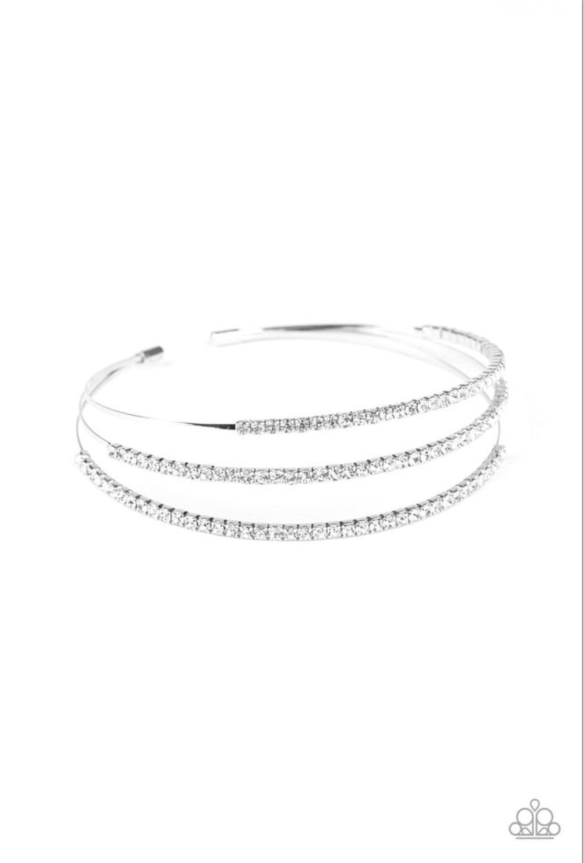 Sections of glittery white rhinestones are encrusted along the tops of three dainty silver bars that coalesce into a glitzy cuff around the wrist.