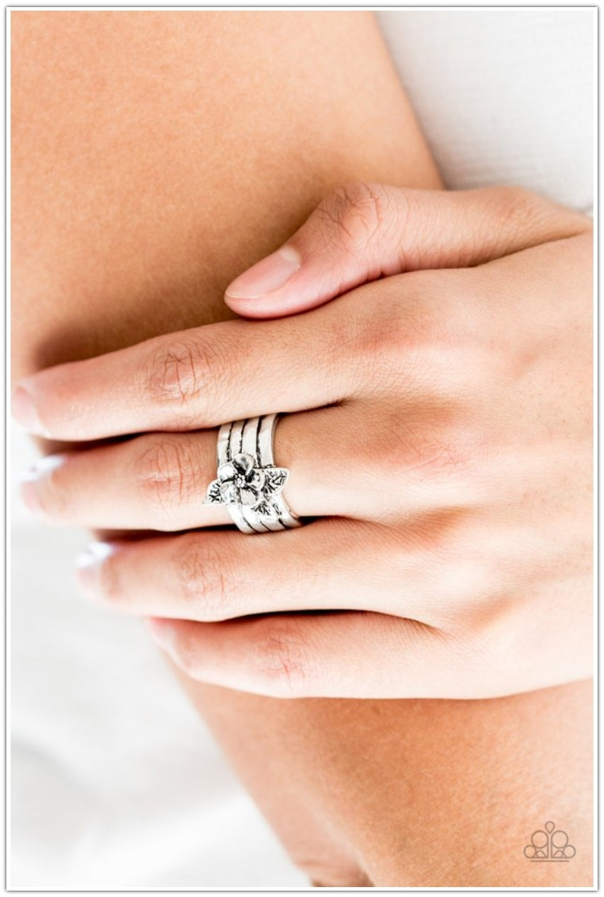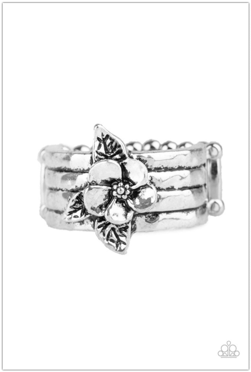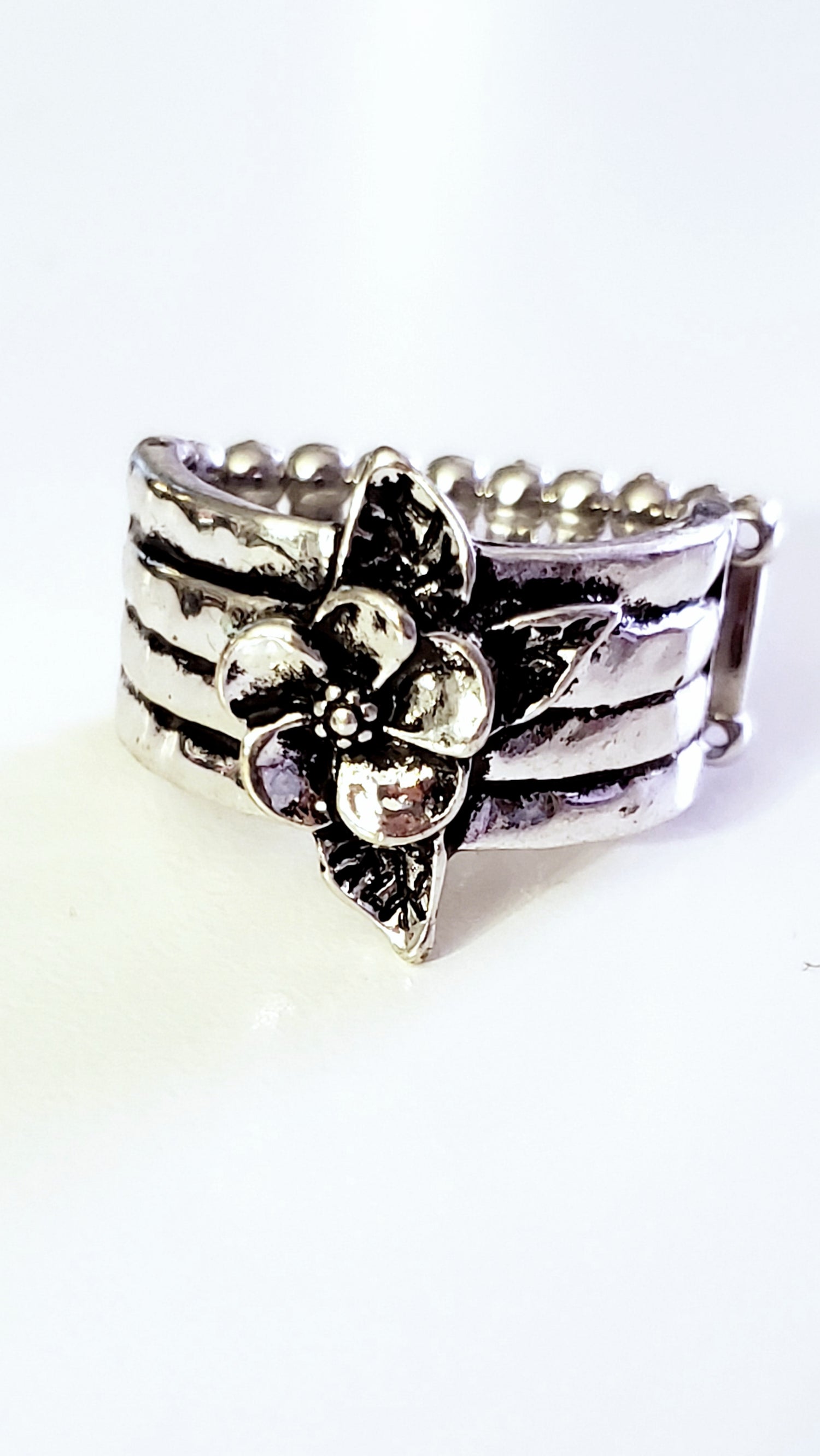 A leafy flower blooms from the center of a thick silver band rippling with hammered and linear textures. Features a stretchy band for a flexible fit.
