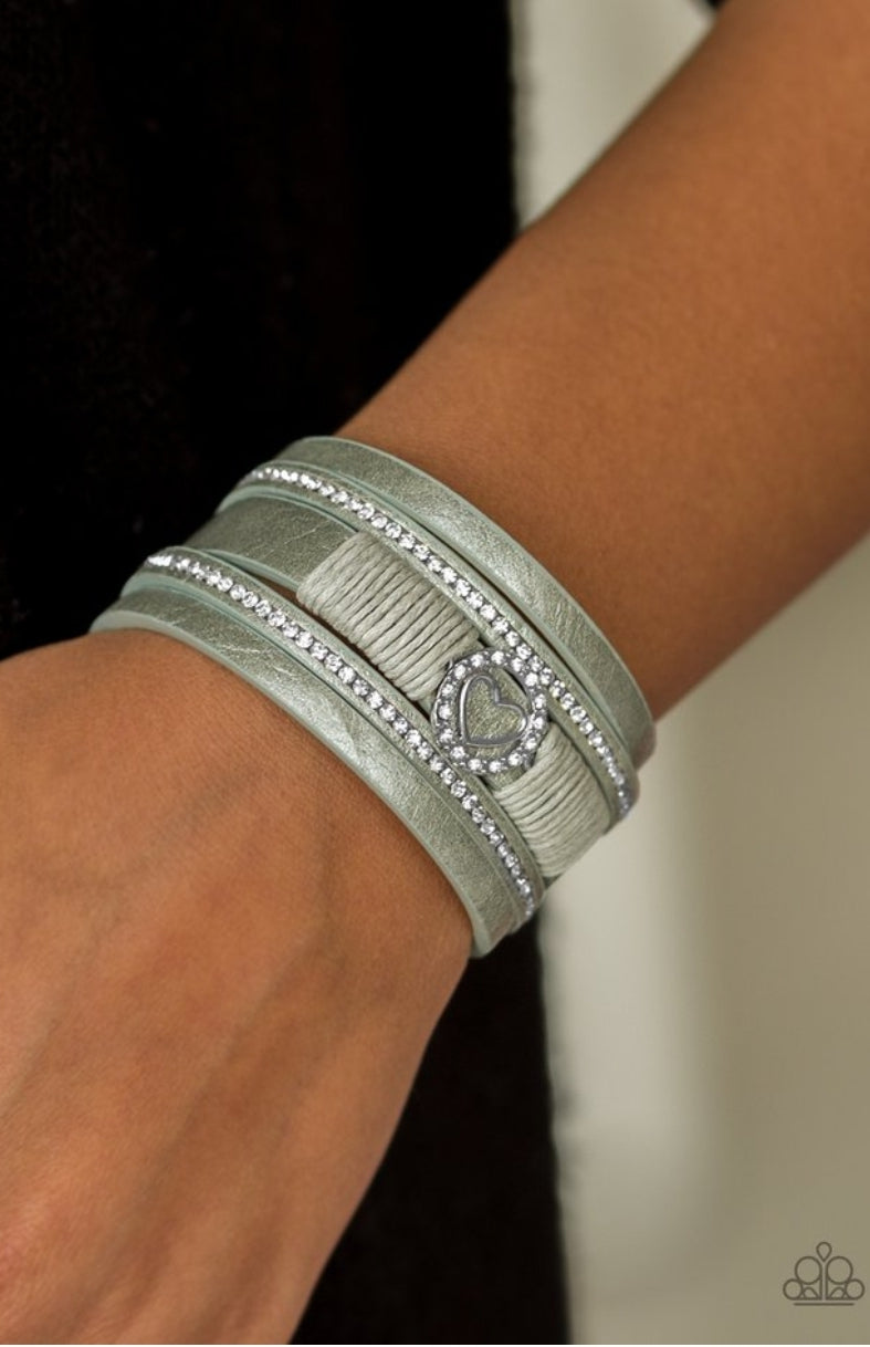 Brushed in a metallic shimmer, strips of green leather are encrusted in alternating rows of glittery white rhinestones. Green cording knots around the centermost strand, securing a sparkling heart frame in place for a whimsical finish. Features an adjustable clasp closure.