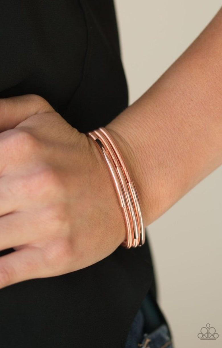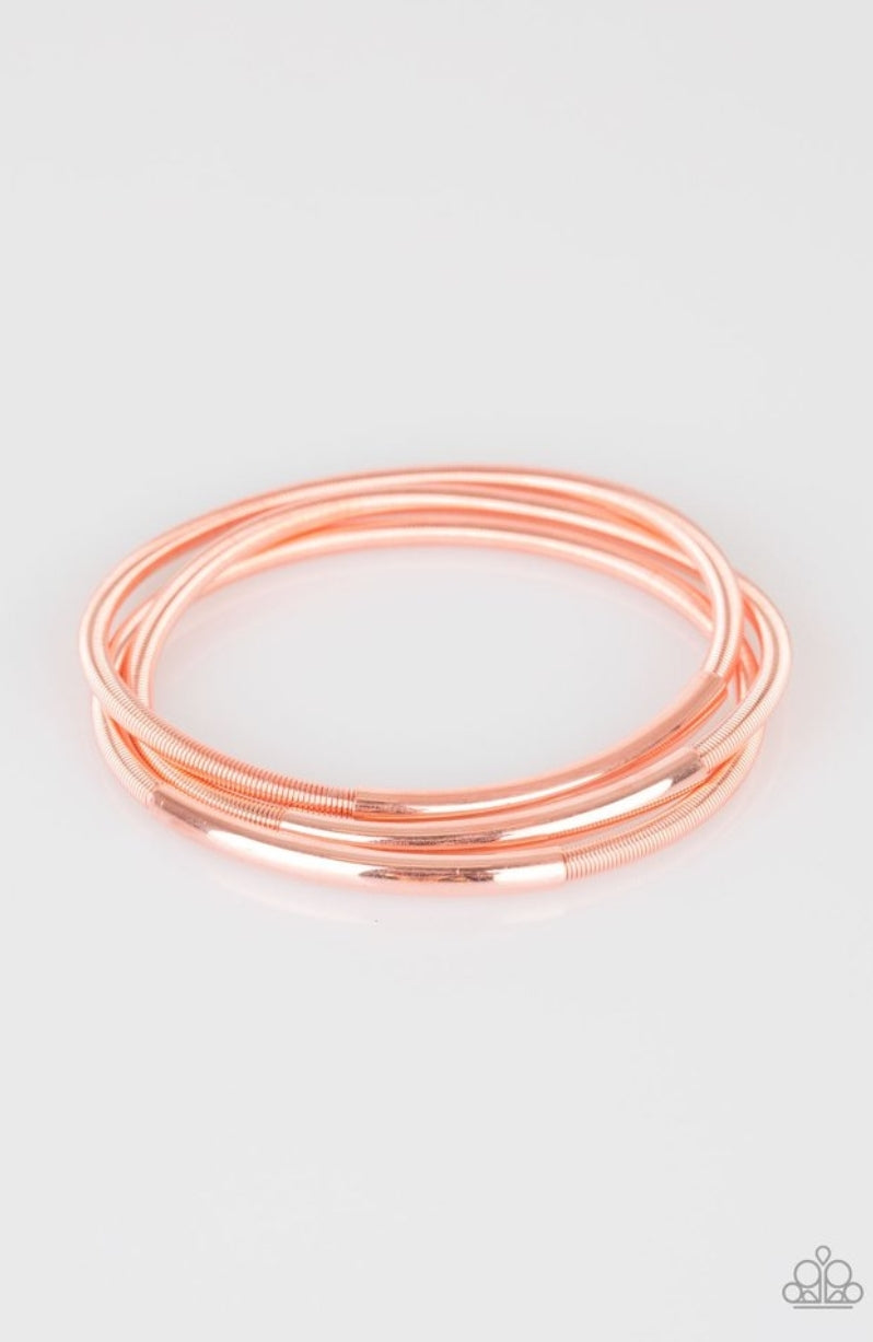 A collection of shiny copper accents slide along stretchy spring-like wires for a sleek industrial look.