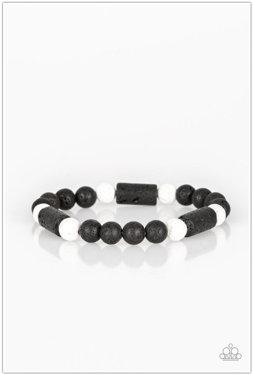 A collection of earthy black lava rock and tranquil brown stone beads are threaded along a stretchy band around the wrist. Cubed and pentagon-shaped black lava rock accents adorn the center for a seasonal finish.