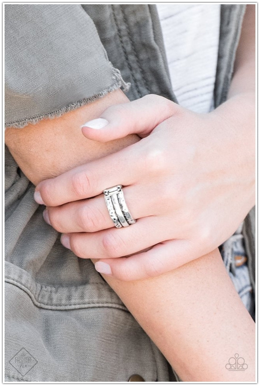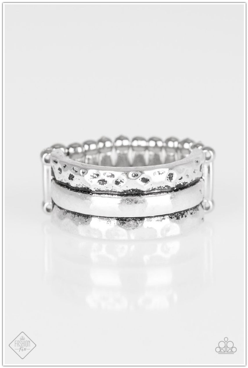 Brushed in a gritty antiqued finish, a smooth silver bar races down the center of a hammered silver band for an edgy look. Features a stretchy band for a flexible fit.