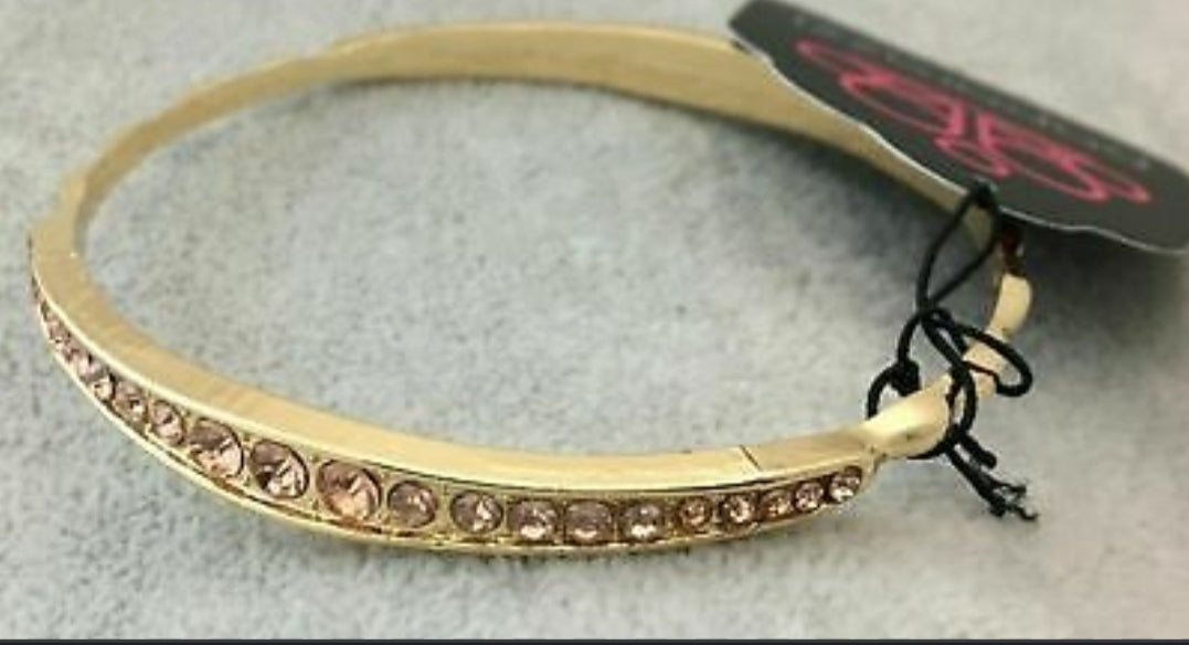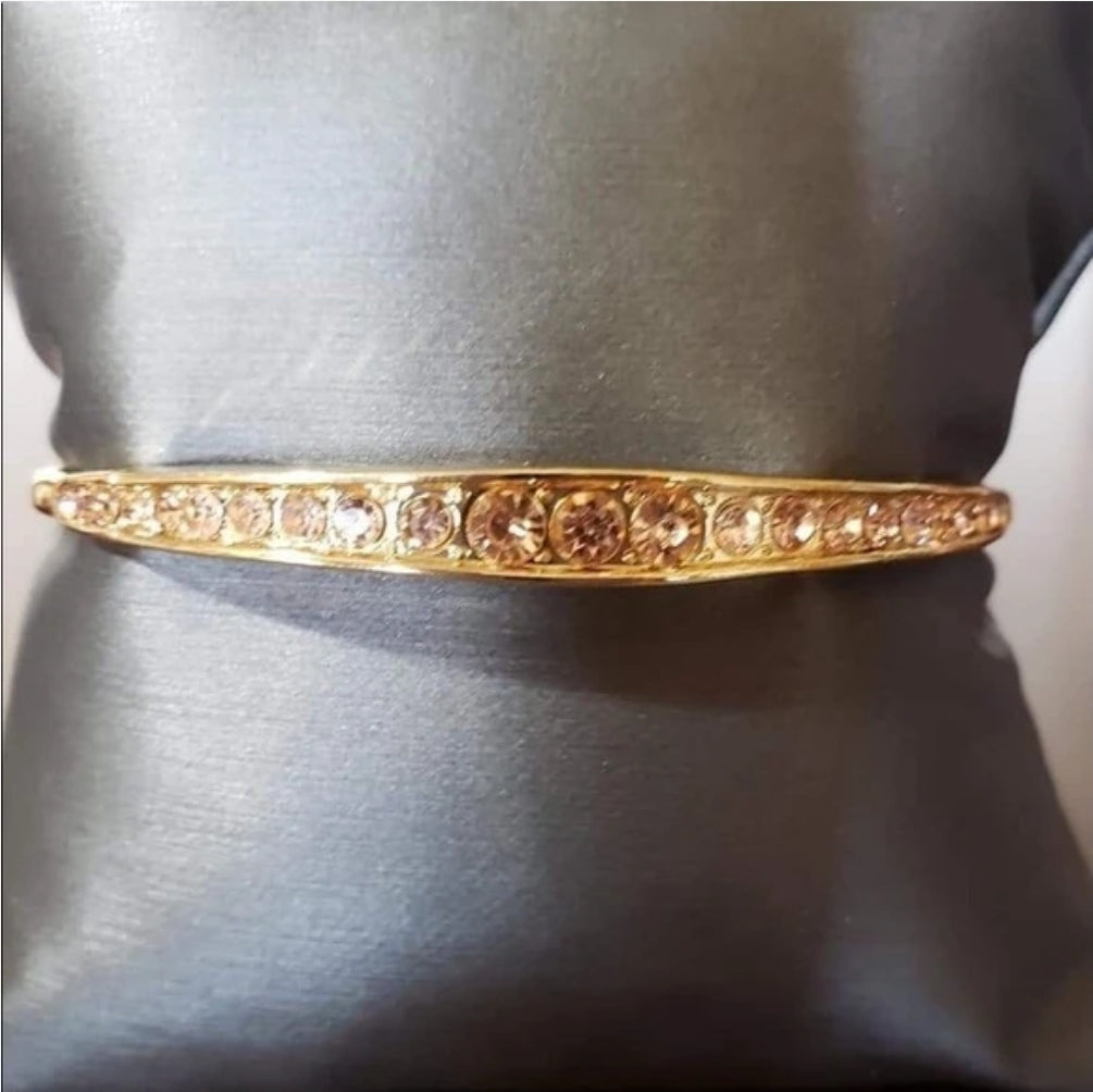 Gradually increasing in size at the center, two sections of topaz rhinestones are encrusted along a dainty gold bangle rippling with wavy textures for a timeless twist.
