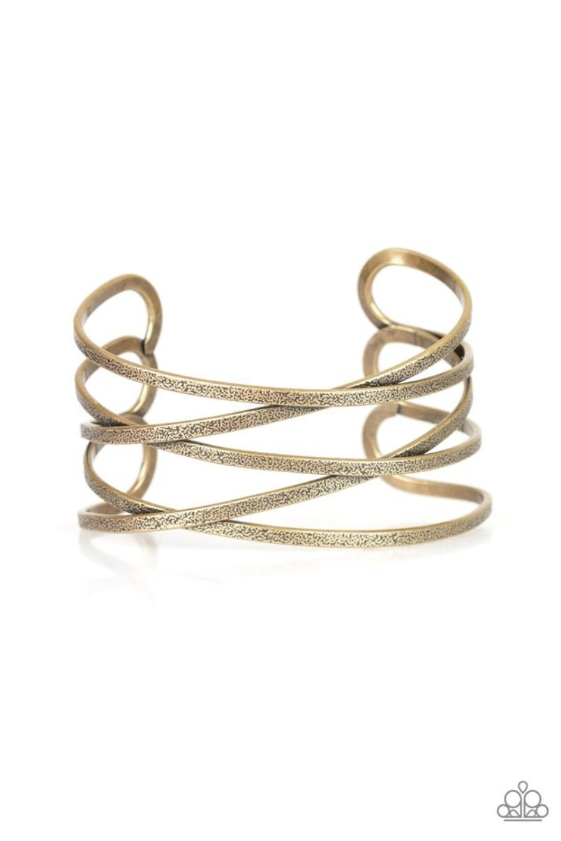 Delicately hammered in shimmery textures, antiqued brass ribbons crisscross across the wrist, coalescing into an airy cuff.