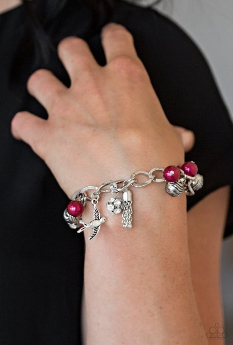 Red pearls, ornate silver beads, and white rhinestone encrusted accents swing from a dramatic silver chain. A shimmery silver bird charm and silver tassel are added to the display, creating a whimsical fringe around the wrist. Features an adjustable clasp closure.
