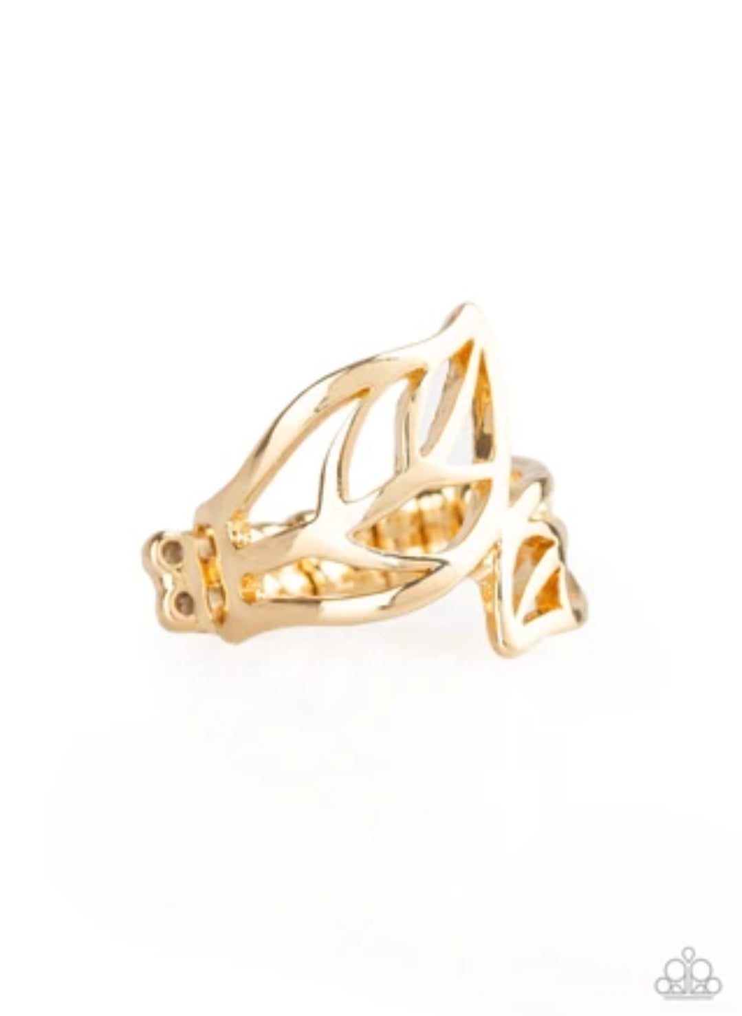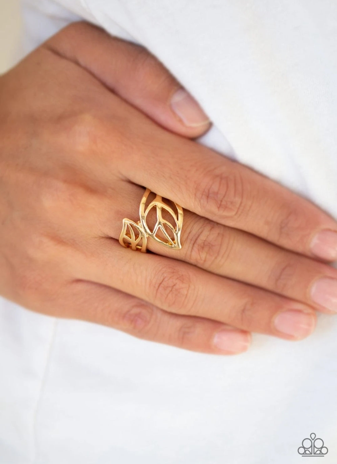 Brushed in a high-sheen finish, leafy gold bands curl around the finger in a seasonal fashion. Features a dainty stretchy band for a flexible fit.