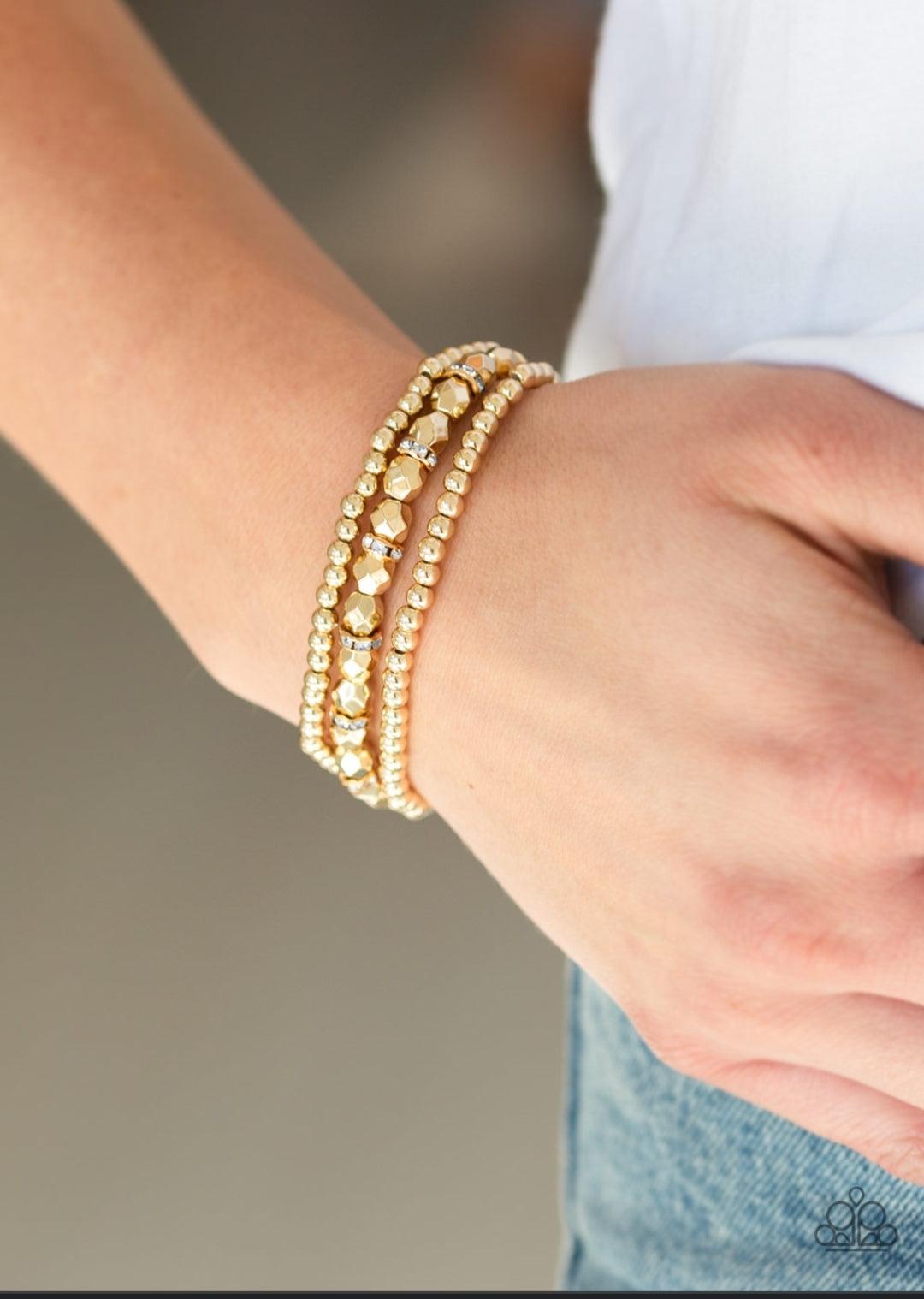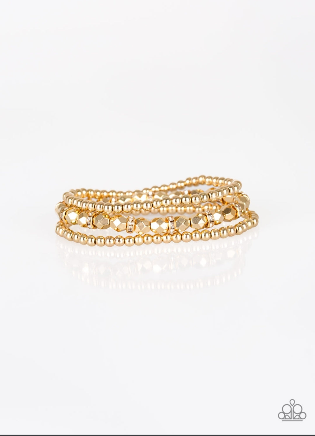 Infused with white rhinestone encrusted rings, mismatched dainty silver and faceted gold beads are threaded along stretchy bands for a refined look.